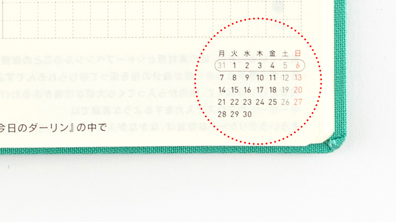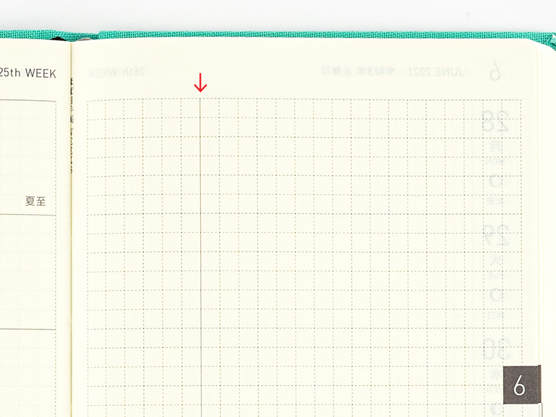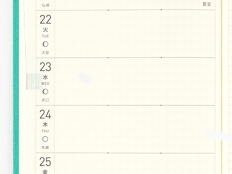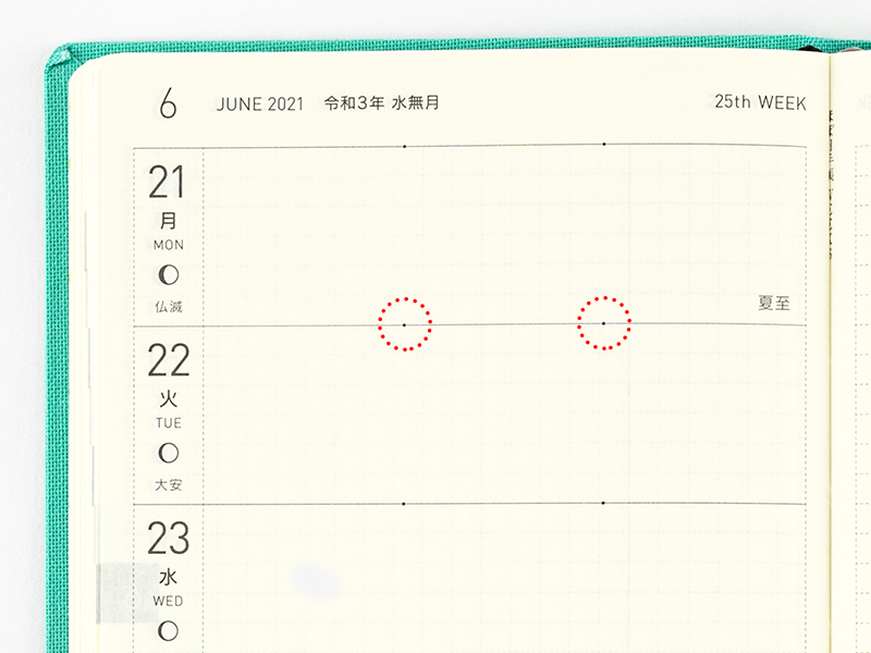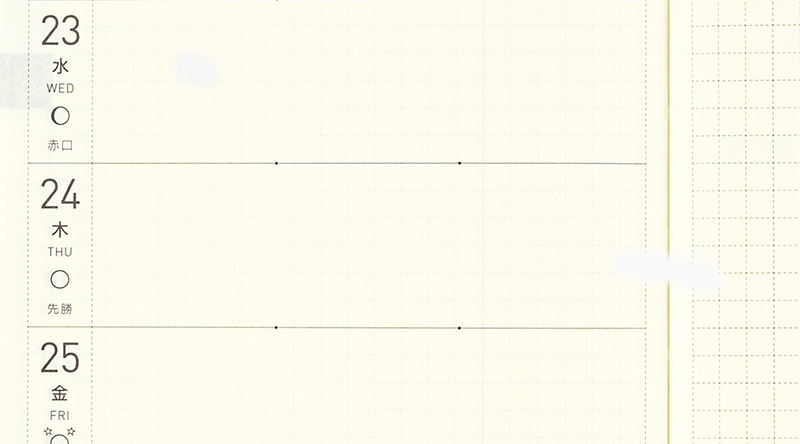 In order to facilitate the most efficient use of the limited space in each day, we’ve included two subtle dots to split each day into morning, afternoon, and evening. You can use these however you see fit, such as writing plans in the two left spaces and random notes in the one right space, or disregarding the dots altogether.