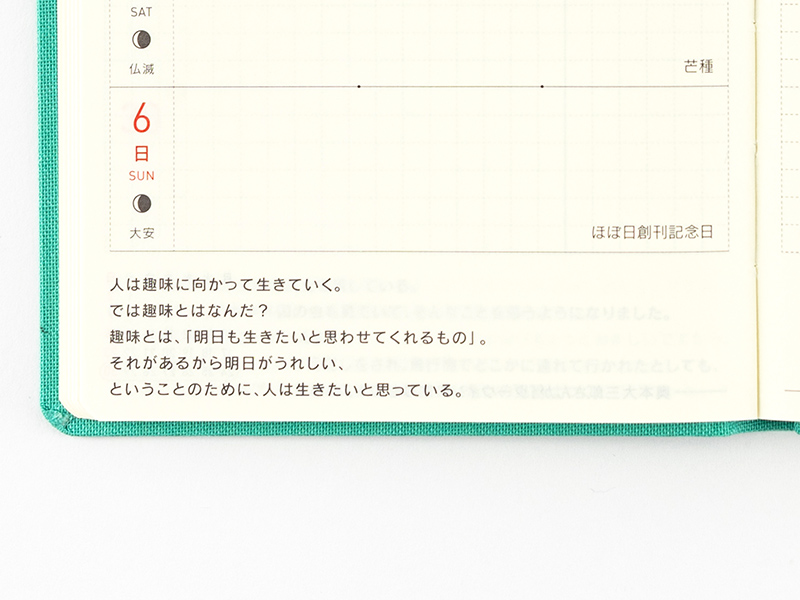 From the heartfelt to the humorous to the whimsical, each weekly spread of the planner features a quote specially selected from the planner’s parent site, Hobo Nikkan Itoi Shinbun. The quotes for the Weeks version are only in Japanese. If you would like the quotes in English, please buy the Hobonichi Techo Planner.