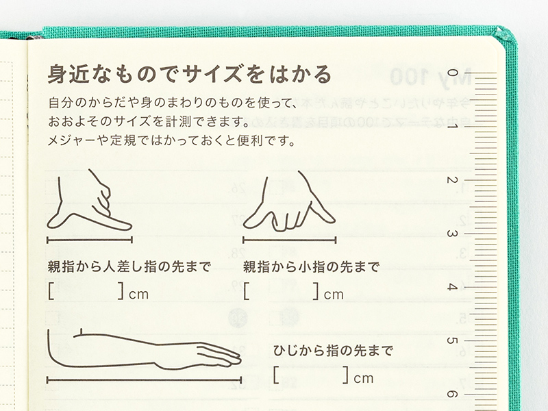 This page is useful for measuring short sizes when you’re out and about. The edge of the page is printed with an 18 cm ruler.