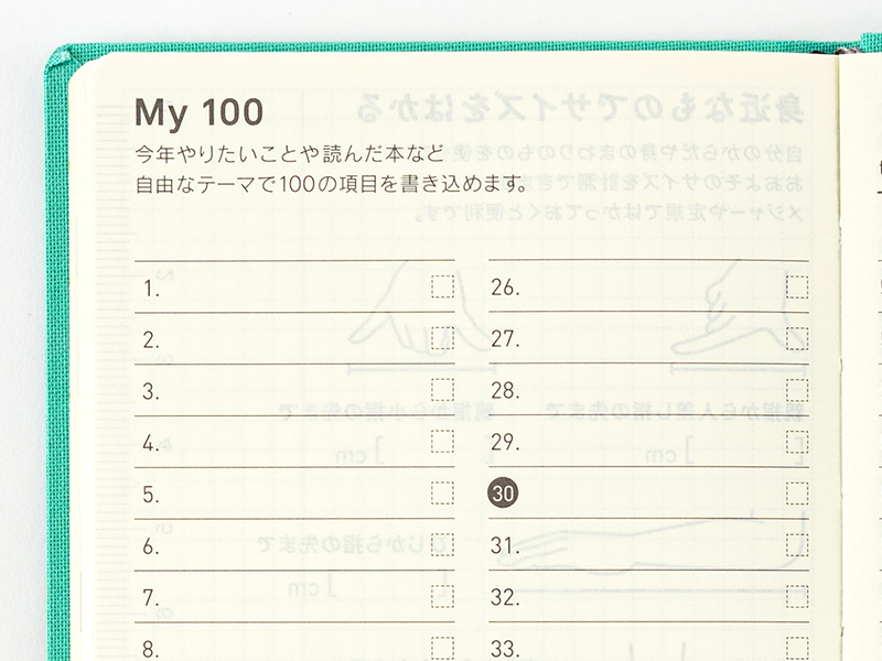 This popular 100-item list from the 2018-edition Hobonichi Techo has made its comeback. You can make a list for anything you want: things to accomplish this year, books you’ve read, movies you’ve seen, snacks you’ve tried, shops you want to visit — it’s up to you!