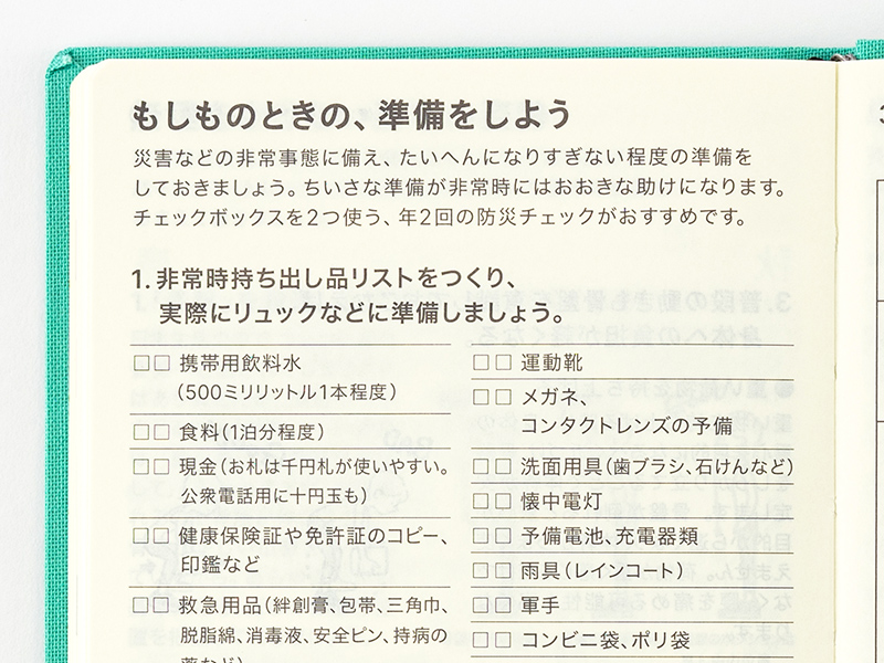 This page contains a checklist of items to have ready in case of an emergency. There is also a space to list nearby evacuation zones (common in Japan), emergency contact information and topics discussed between family and friends.