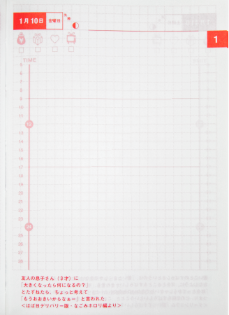 The techo’s daily pages were updated to include the “secret line,” a vertical dividing line that’s handy for those who’d like to use it, but is otherwise easy to ignore. The checkboxes were simplified, and this was also the first year that daily quotes were included for each of the book’s 365 days. These features are unique to Hobo Nikkan Itoi Shinbun’s special techo, and carry on every year.