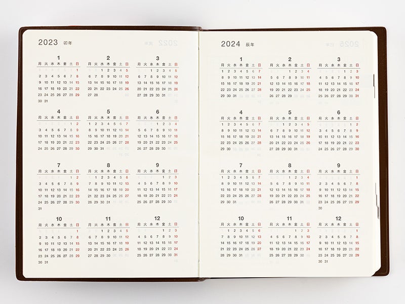 The yearly calendar is the first section in the book. It contains a year per page and spans 5 years. Listed next to the year is the Chinese zodiac animal for that year.