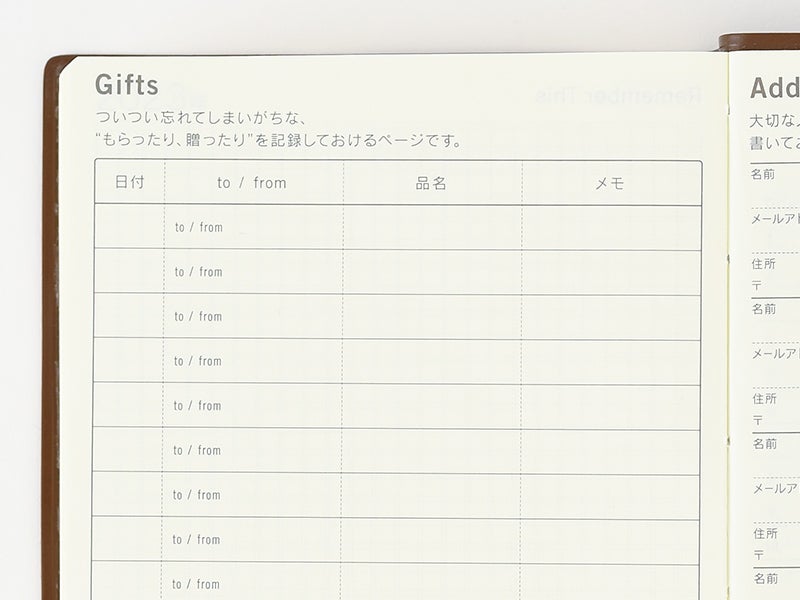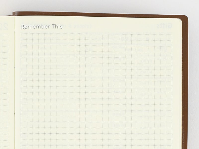 Record the presents you’ve given or received in the Gifts page so you don’t forget who gave what to who and when. This is also helpful for thank-you cards. There are spaces for 17 entries in the A6-size book and 40 entries in the A5-size book.