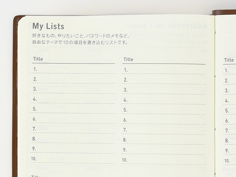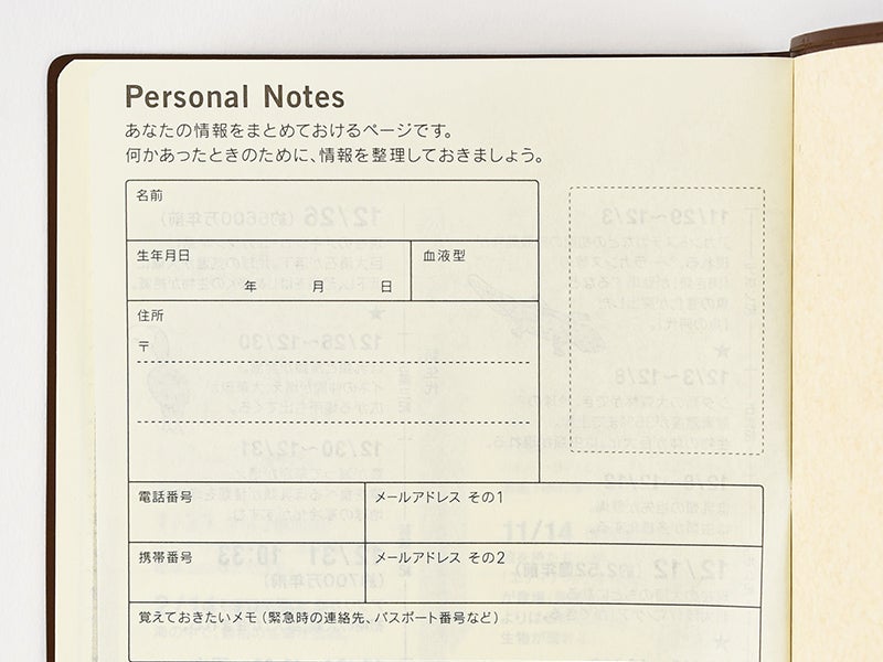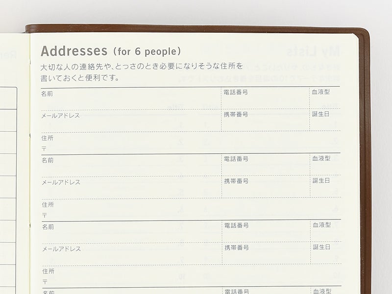 The address book allows you to write in the contact information for people such as family and close friends. The A6-size book has space for 6 entries, and the A5-size book has space for 16 entries.