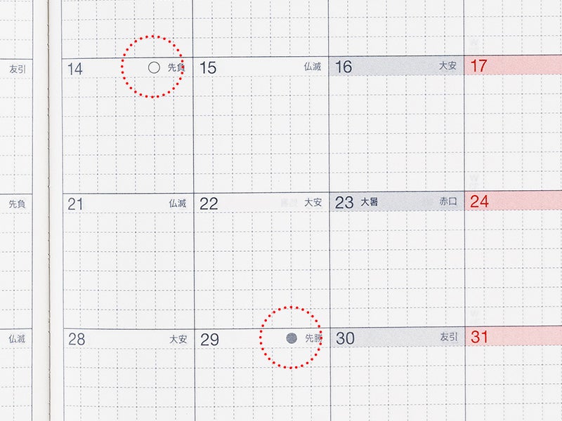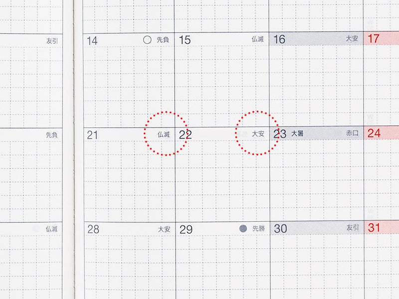 The monthly calendar days are labeled with rokuyo, a cycle of six days said to predict good or bad fortune that day. The labels are commonly found on Japanese calendars and used to plan weddings and funerals.