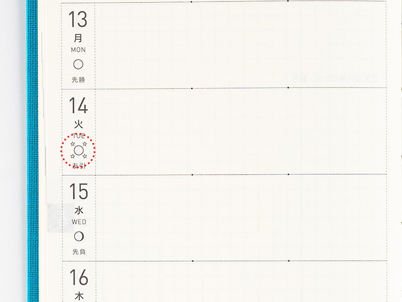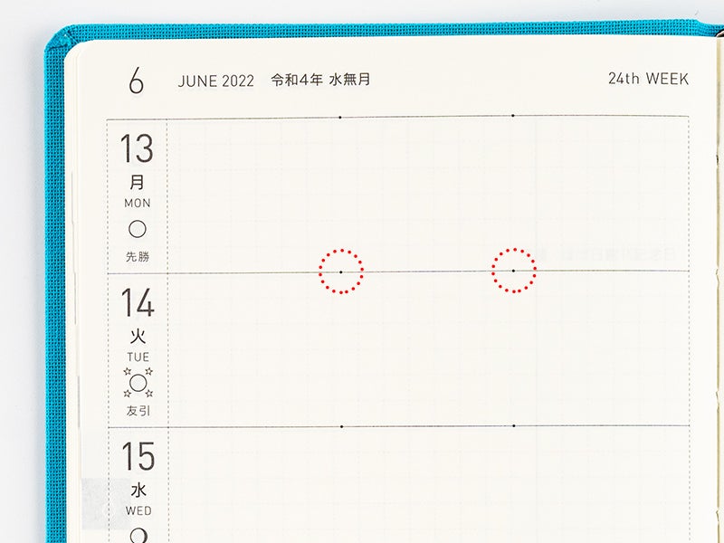 In order to facilitate the most efficient use of the limited space in each day, we’ve included two subtle dots to split each day into morning, afternoon, and evening. You can use these however you see fit, such as writing plans in the two left spaces and random notes in the one right space, or disregarding the dots altogether.