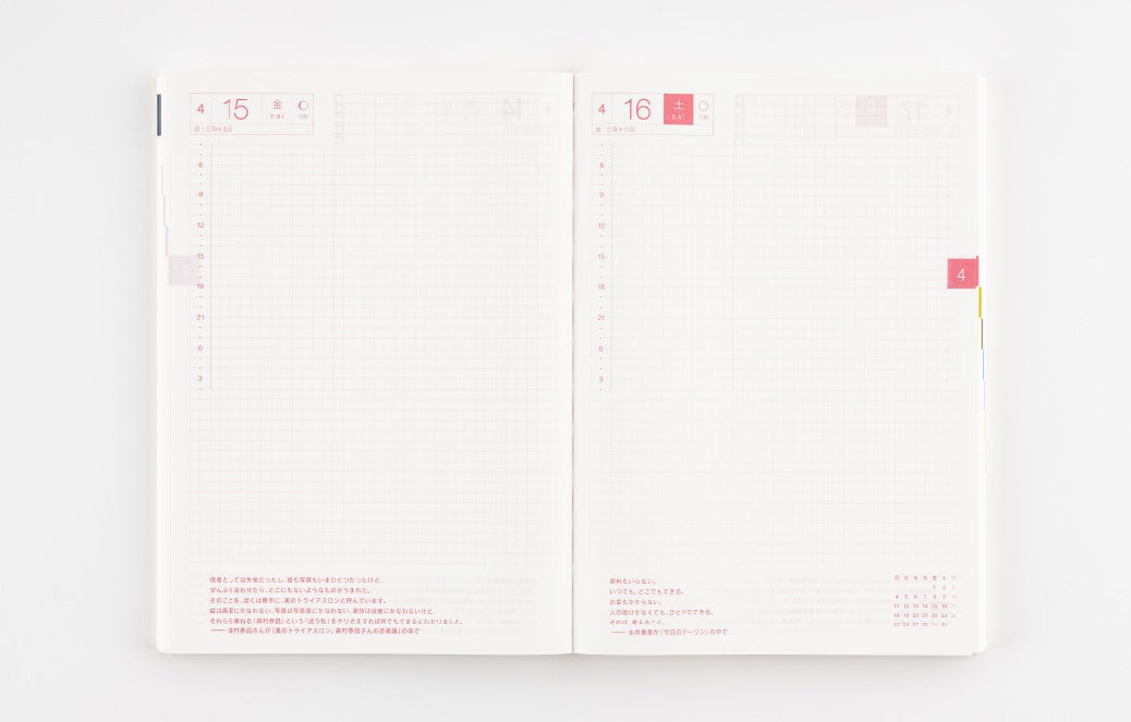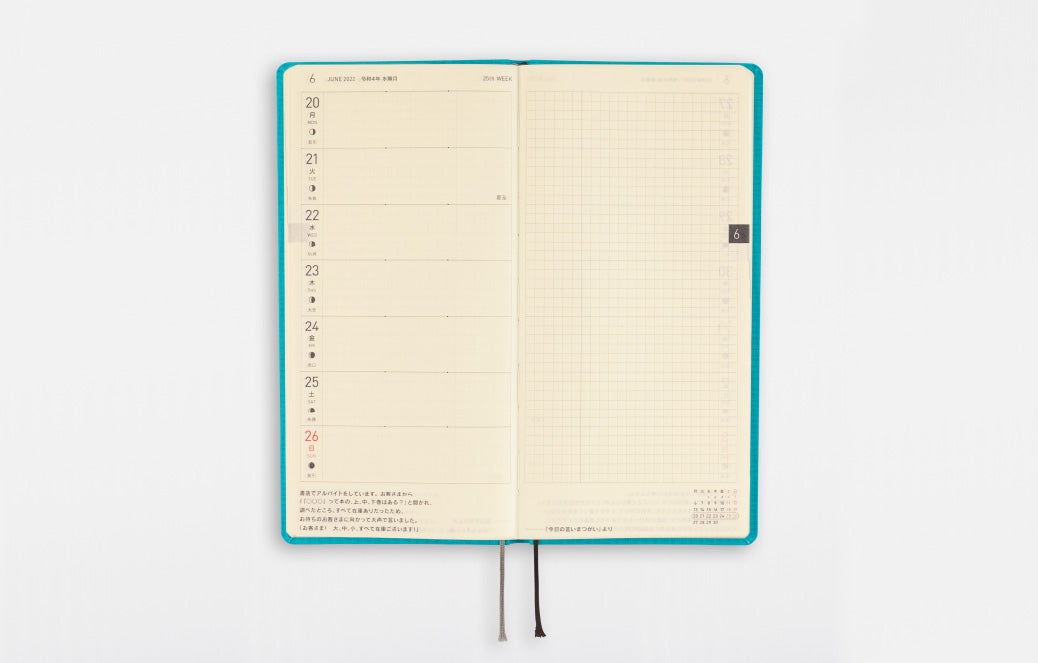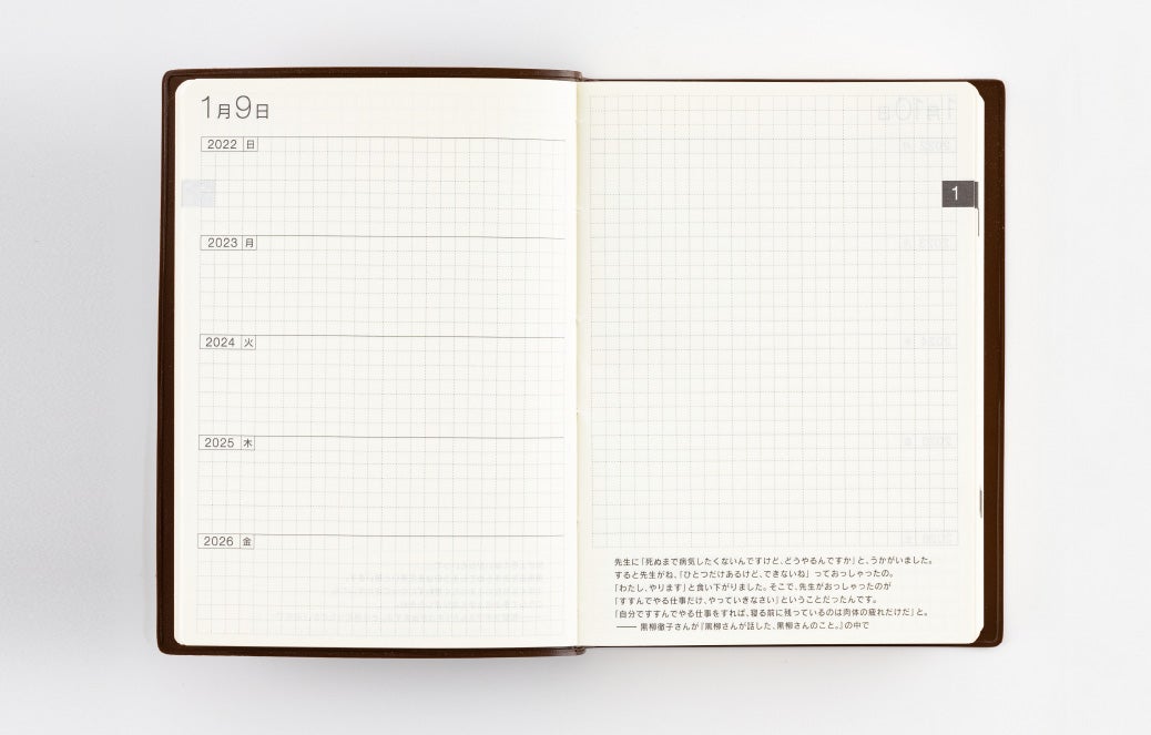 This weekly, slim and long techo is the Weeks. It’s light and easy to carry around, and a week is visible on each page spread so you can see your plans for the week at a glance.There are ample blank memo pages, so you can write all kinds of things—things that caught your eye, books you read, movies you watched, or anything else you can think of.