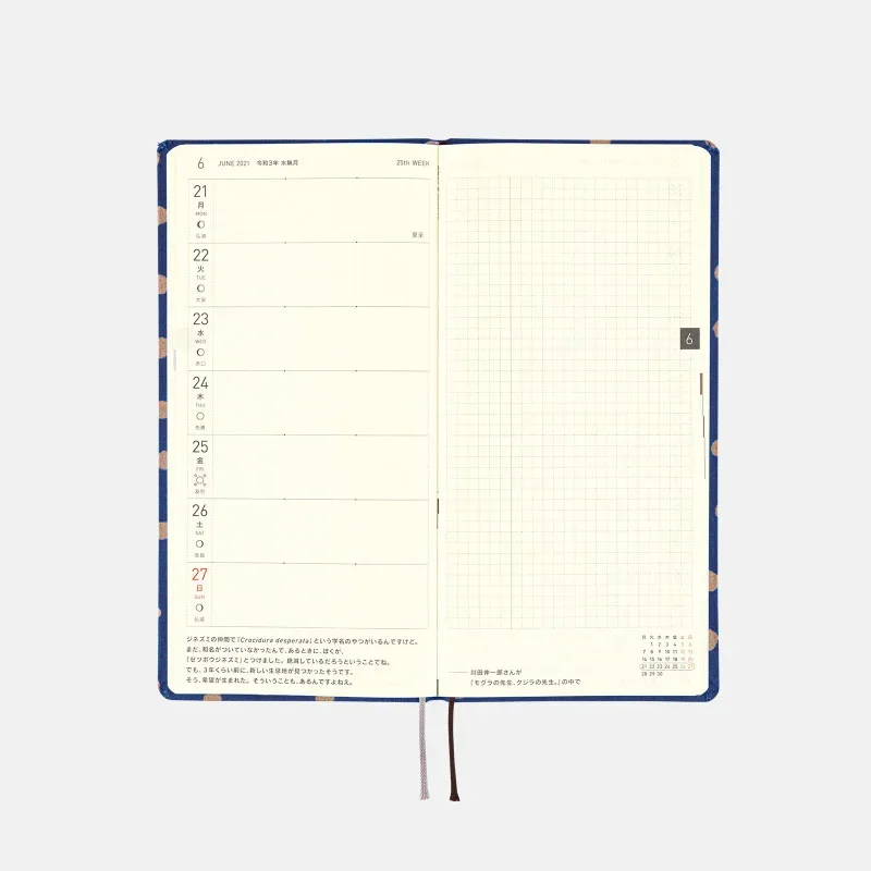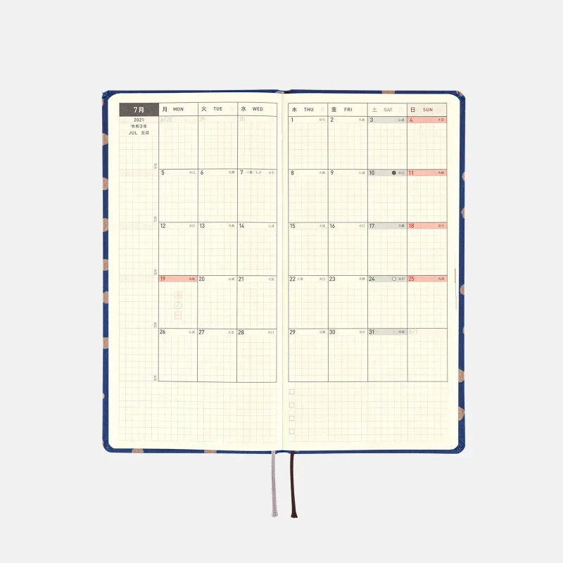 | Listed Information | Week of the year / Rokuyo (traditional Japanese calendar) / Solar terms / Japanese holidays / Moon phase (weekly pages include every phase, monthly calendars only include full and new moon) *The 2021 Weeks book (April Start) is produced based on information as of September 2020, and therefore does not reflect the amendment in dates of the following national holidays: Marine day, Mountain day, and Sports day. We apologize for the inconvenience caused and ask for your kind understanding. |