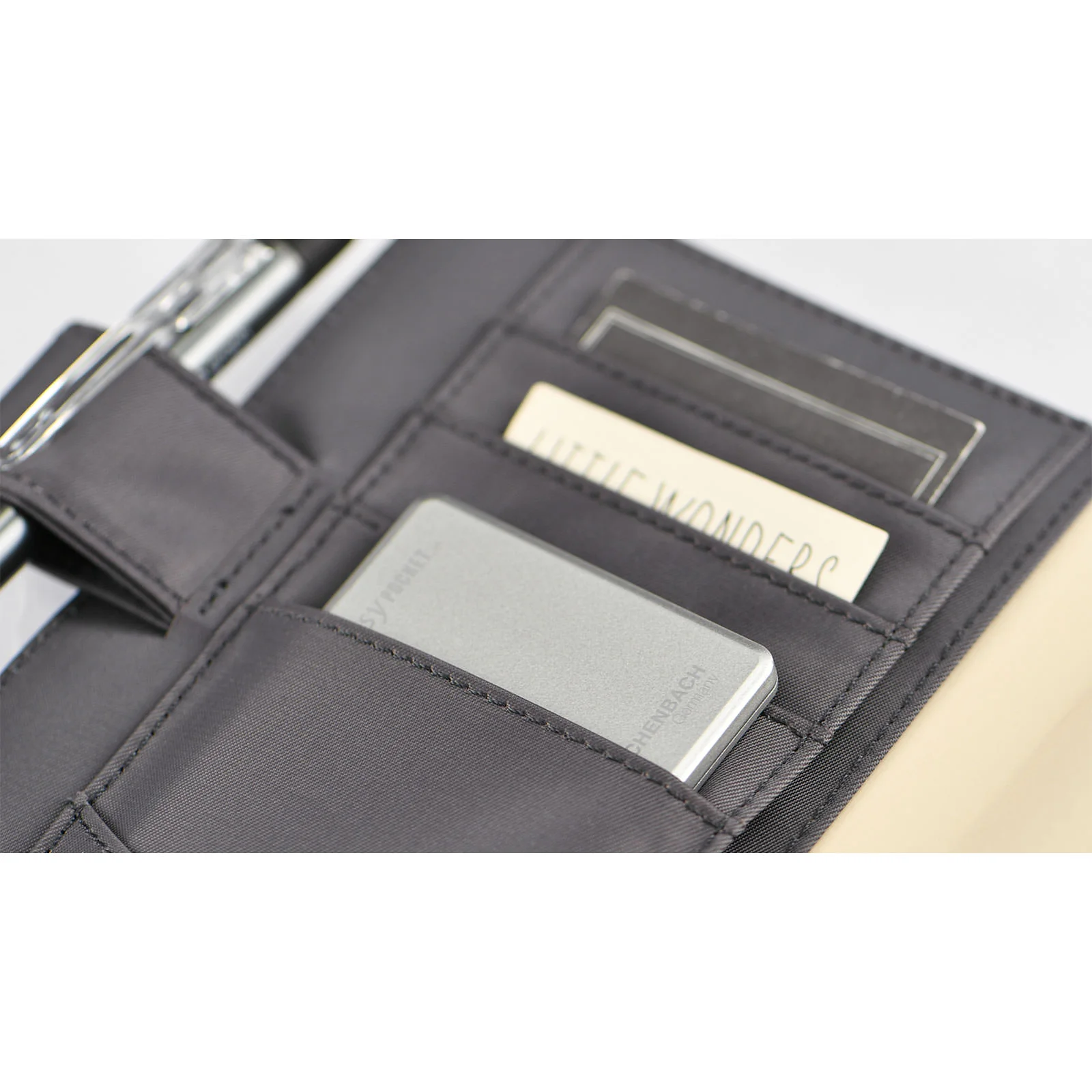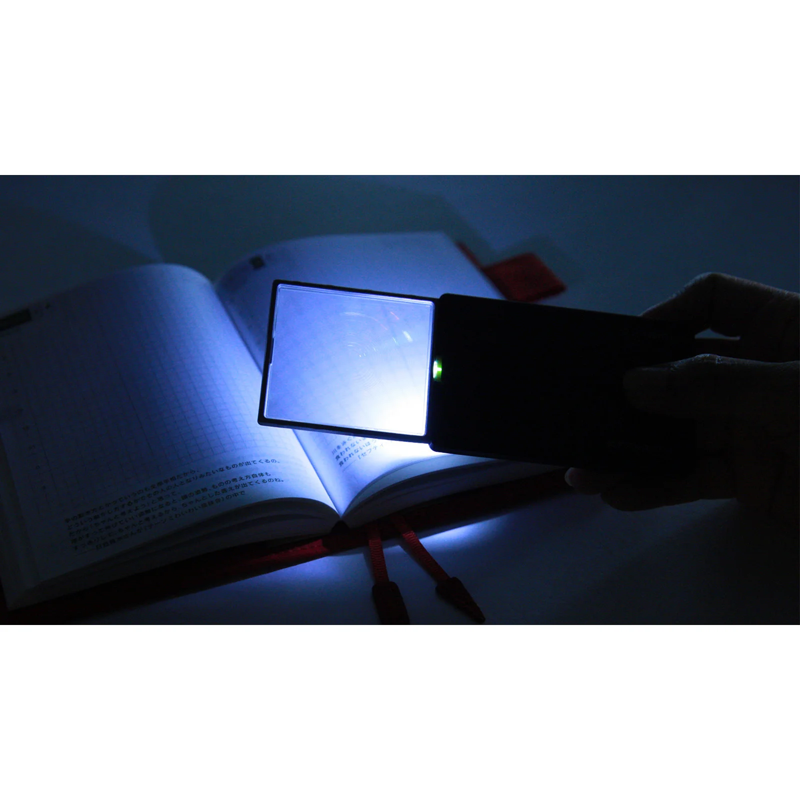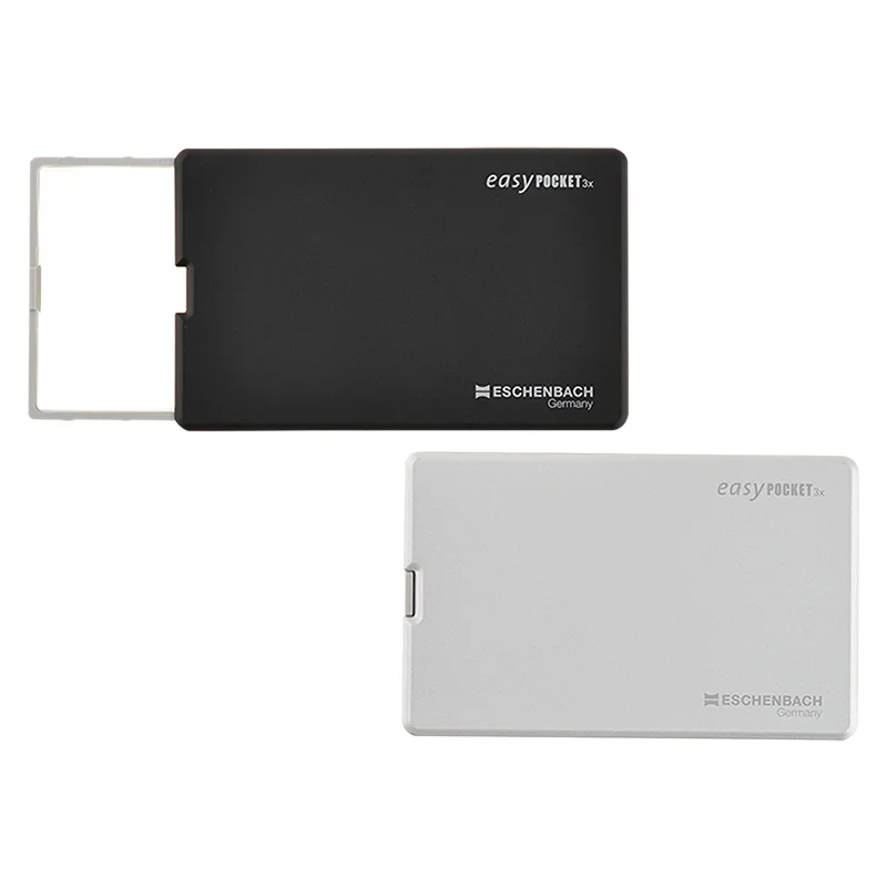 This thin magnifying glass is by Eschenbach Optik of Germany, which has been making loupes for over a century. The business card size makes it portable, as do its modest 6 mm thickness and light weight of only 31 g which allow it to fit into the pocket of a planner cover. It includes an LED light for use in the dark, and the watch battery provides 5 hours of continuous light.