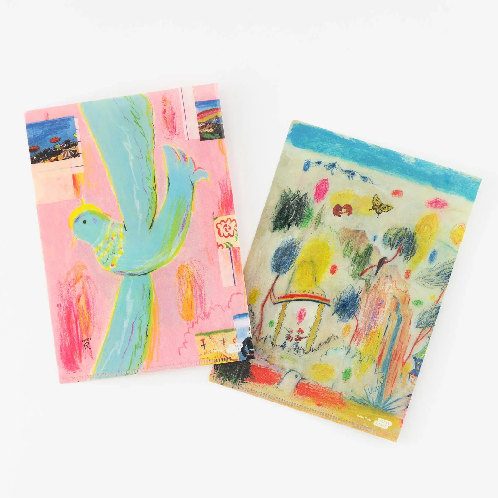 This set of 2 see-through folders fits perfectly into the pockets of A5 size Hobonichi Techo covers. The folders can store receipts, clippings, and other items to help organize your desk, or carry tickets, postcards, checkbooks and other items you want to keep portable and accessible. The artwork is by children book illustrator Ryoji Arai.