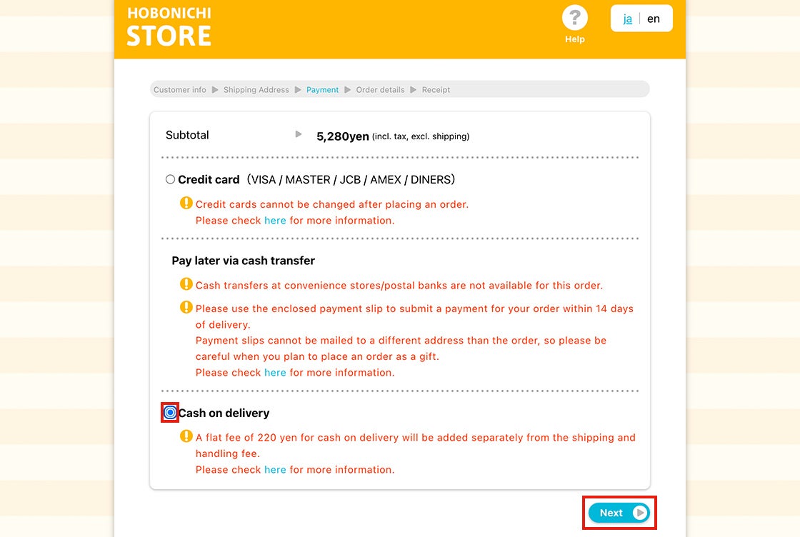 This payment method is only available for orders placed within Japan. An additional handling fee of 220 yen will be added to the order. Cash only.