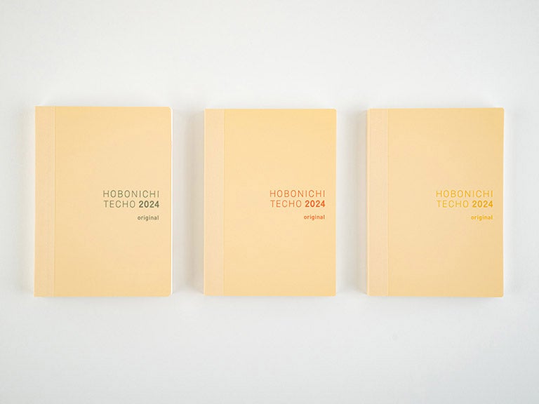 The front has a soft ivory hue, and features the label “HOBONICHI TECHO 2024 original” printed in gray letters if the book’s weekly calendars start on Monday and red if they start on Sunday. The April-start version includes the label “spring.”