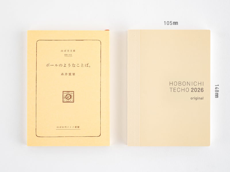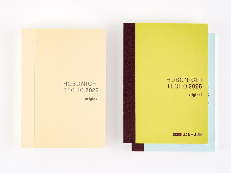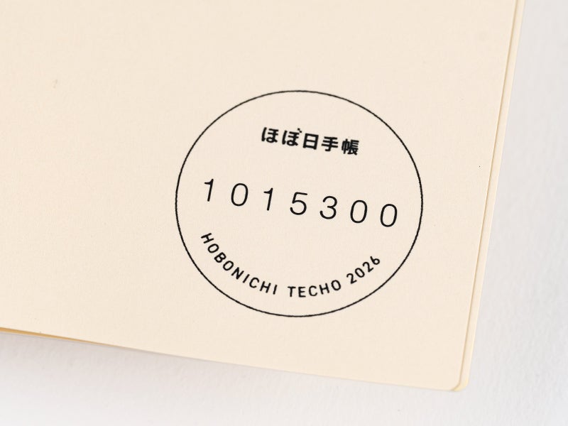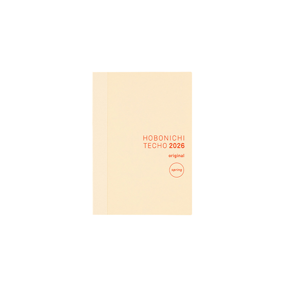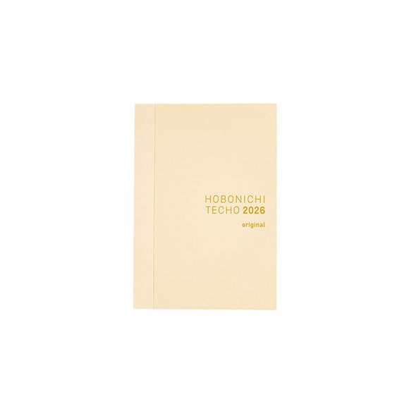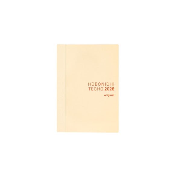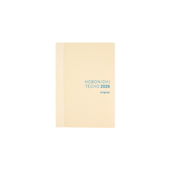 "The front has a soft ivory hue, and features the label “HOBONICHI TECHO 2026 original” printed in gray letters if the book’s weekly calendars start on Monday and red if they start on Sunday.