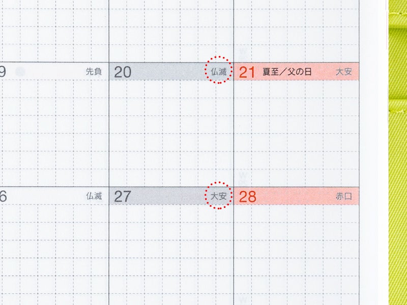 The monthly calendar days are labeled with Rokuyo, a cycle of six days said to predict good or bad fortune that day. The labels are commonly found on Japanese calendars and used to plan weddings and funerals.