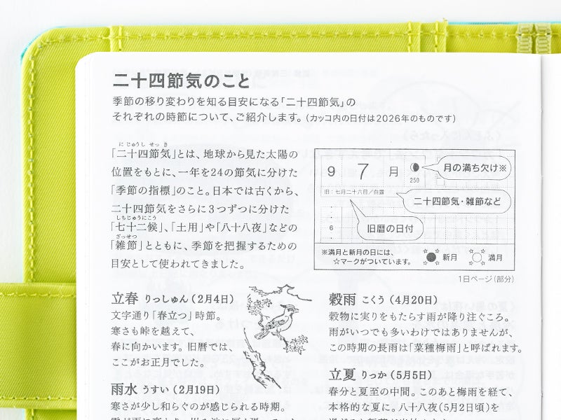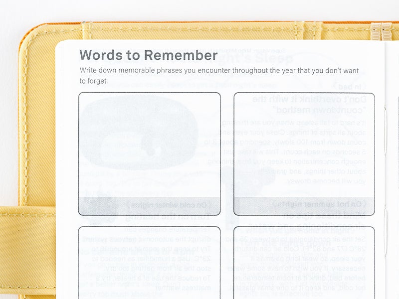 Since its launch in 1998, the Hobonichi website has been updated daily. From various interviews, columns, reader submissions, and Hobonichi School content featured on the site, we’ve thoughtfully selected words that bring joy and delight. These chosen words are displayed at the bottom of each page, one per day.