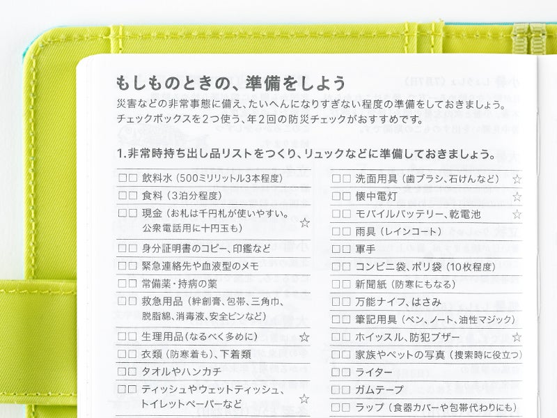 This page contains a checklist of items to have ready in case of an emergency. There is also a space to list nearby evacuation zones (common in Japan), emergency contact information and topics discussed between family and friends.