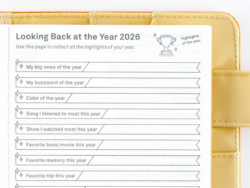 This warming-up page helps you get ready for the new year. It’s a great place to write your reflections on the past year, list your goals for the year ahead, copy down important information from last year’s planner, or do anything else you need to feel prepared.