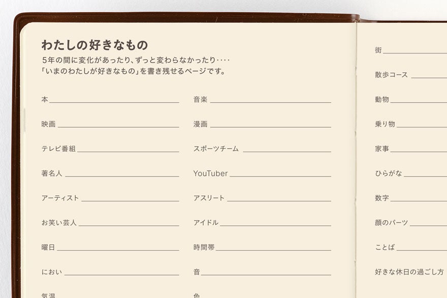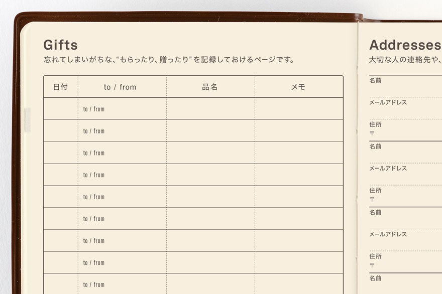 The start of the book contains a yearly calendar across the 5-year span. The back of the book contains useful pages such as “A Year Per Page” memo pages, “Gifts” for tracking gifts given and received, “Addresses” to list important contact information, “My Lists” for making a list of any theme of your choice, “My Favorite Things” to write down your favorite things by answering questions, and “Personal Notes” to record information about yourself. (These pages are in Japanese.)