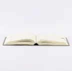The book has the same thread-stitch binding as a dictionary, allowing it to lay flat open for comfortable writing. It stays flat even if you don’t hold it down.