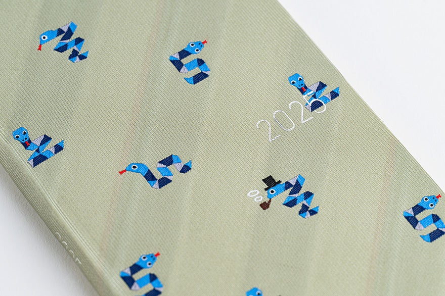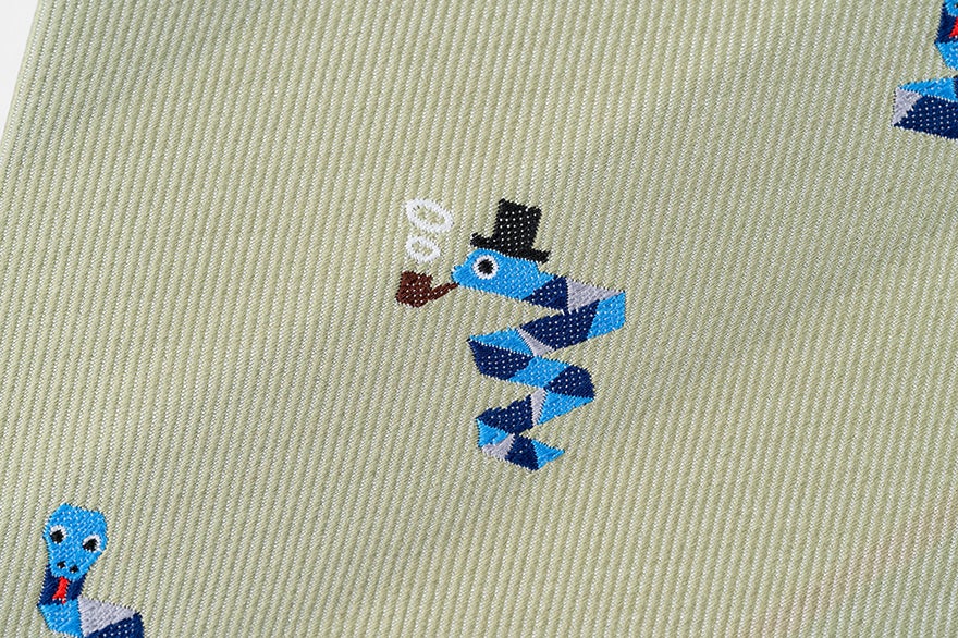 In the Snake Toy pattern, toy-like snakes are lined up on a light gray-beige cover. The design has a cute retro feel, like toys that change shapes when played with. The necktie weave expresses even the most minor details of the snakes in various poses. The fabric used for neckties has a weave texture that is pleasant to the touch and has an appealing silky luster.