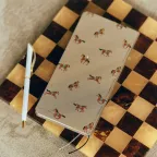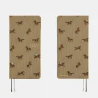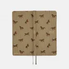 The Bow & Tie series is covered with the same textured, shiny fabric used in neckties. The material has a beautiful gloss and is soft to the touch. On this Galloping Horses cover, a variety of horses—some galloping, some walking—are woven into a chic beige background. The horses spending their time in leisure are depicted in fine detail through the intricate weave of necktie fabric.