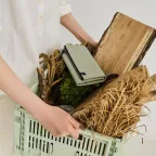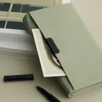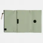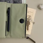 Its standout feature is the generously sized pocket, but its overall appearance remains clean and minimal. With its calming and gentle oakmoss color, the design is versatile and suits anyone. Though it folds into thirds and fastens with a magnetic closure, the cover is light in hand. The aim was effortless elegance, something that looks sharp without being flashy. The material is a soft nylon with a sophisticated sheen.