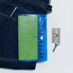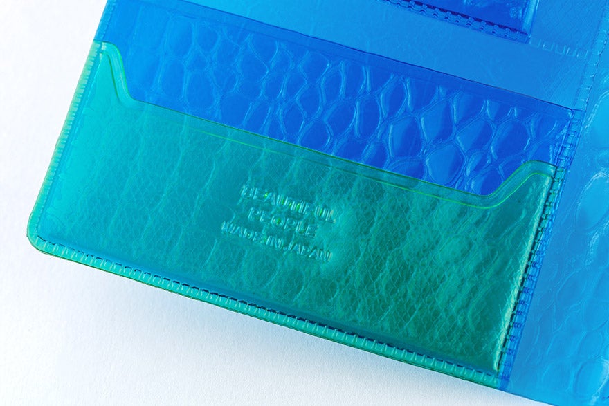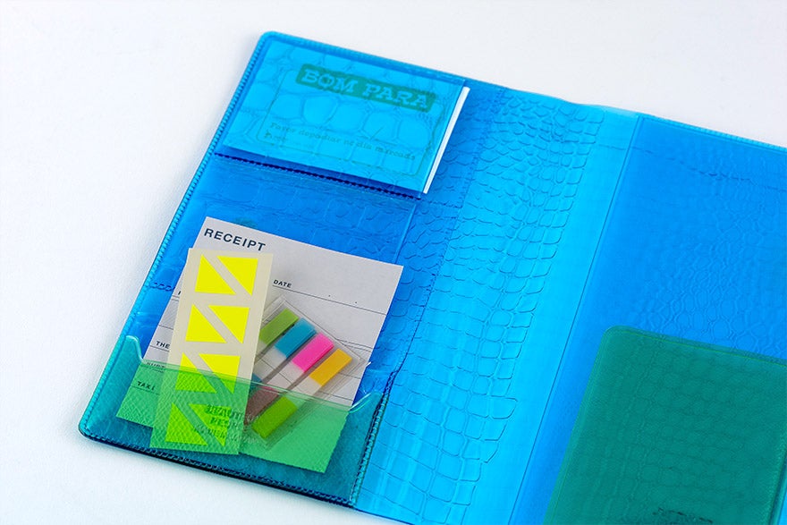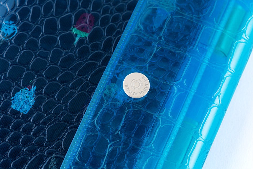 The cover features a crocodile-embossed pattern on PVC. By pairing the transparency of PVC with the embossed texture of natural leather, this design captures beautiful people’s signature sense of playful contrast.