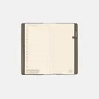 In the cover interior, you will find a slit-type pocket, perfect for storing business and other cards. Included is a small bookmark, made with the same leather as the cover and pressed in gold foil with the Hobonichi logo. You can put this between the pages to always find your place.