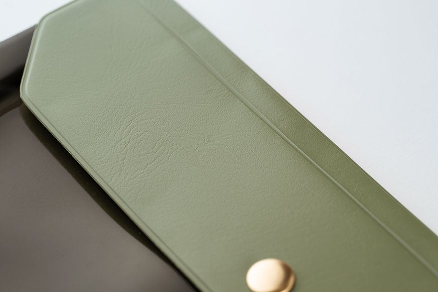 This handy case can store a Hobonichi Techo HON, documents, writing utensils, and more. While looking elegant with a calming color scheme, the soft PVC material makes it light and easy to carry around. It opens and closes with snap buttons, and its simplified and slim shape makes it fitting for any setting.