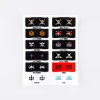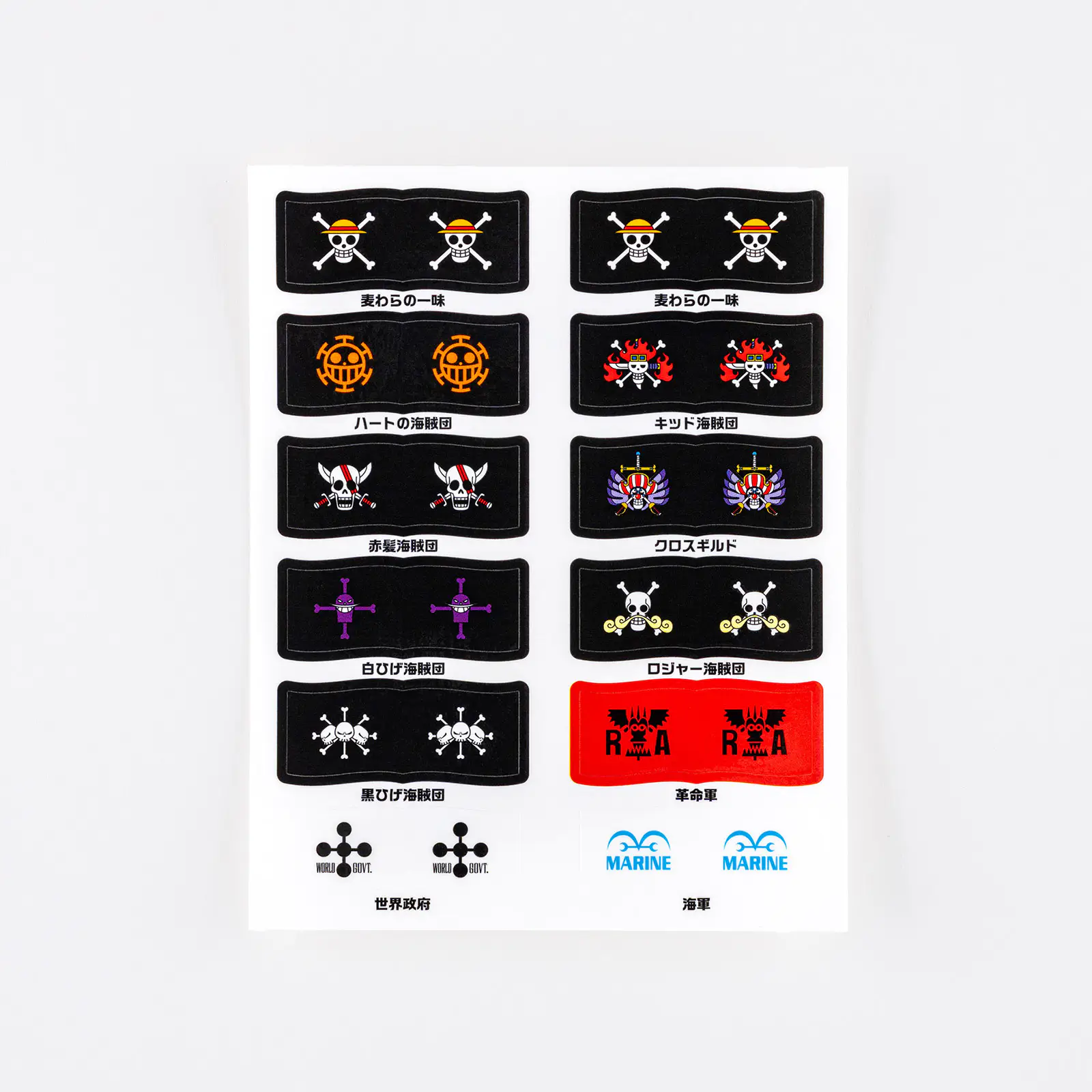 There are eleven different flag designs, one each for the Straw Hat Crew, the Heart Pirates, Kid Pirates, Red Hair Pirates, Cross Guild, Blackbeard Pirates, Whitebeard Pirates, Roger Pirates, Revolutionary Army, World Government, and Marines. There are three sheets with twelve stickers each.