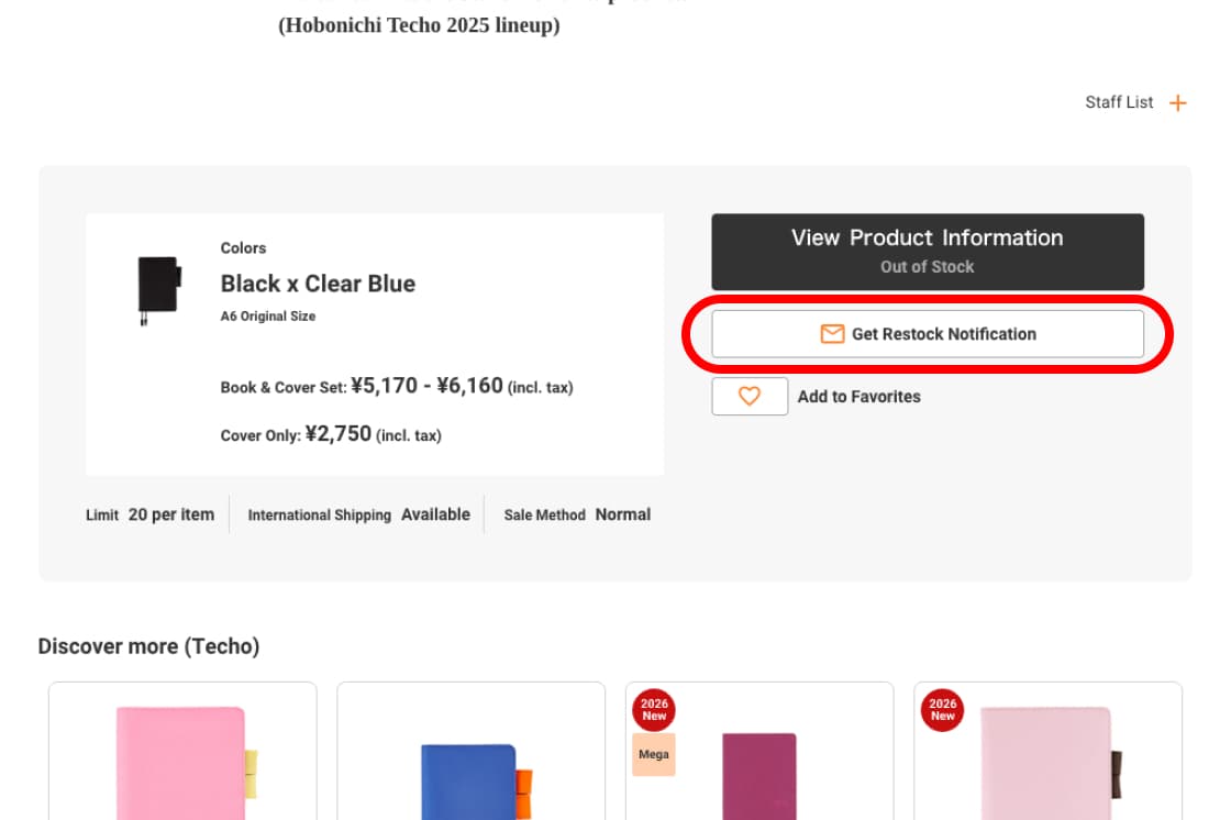 *This service is only available for the Hobonichi Techo and the Drawer Pouch. Restock notification emails are not available for accessories.