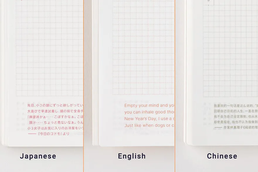 The techo comes in Japanese, English, and Simplified Chinese editions. The English edition, for example, excludes national holidays in the daily pages, yearly calendar, monthly calendar, and yearly index because it’s designed to be used in any country around the world.