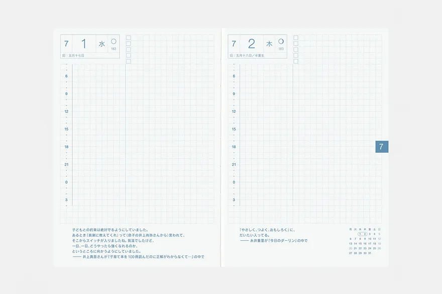 There are daily quotes at the bottom of the pages. These are specially curated from articles on the Hobonichi website, including recurring columns and interviews, and range from heartfelt to humorous. The quotes are from all kinds of people, including creators, actors, our readers, and Shigesato Itoi himself.