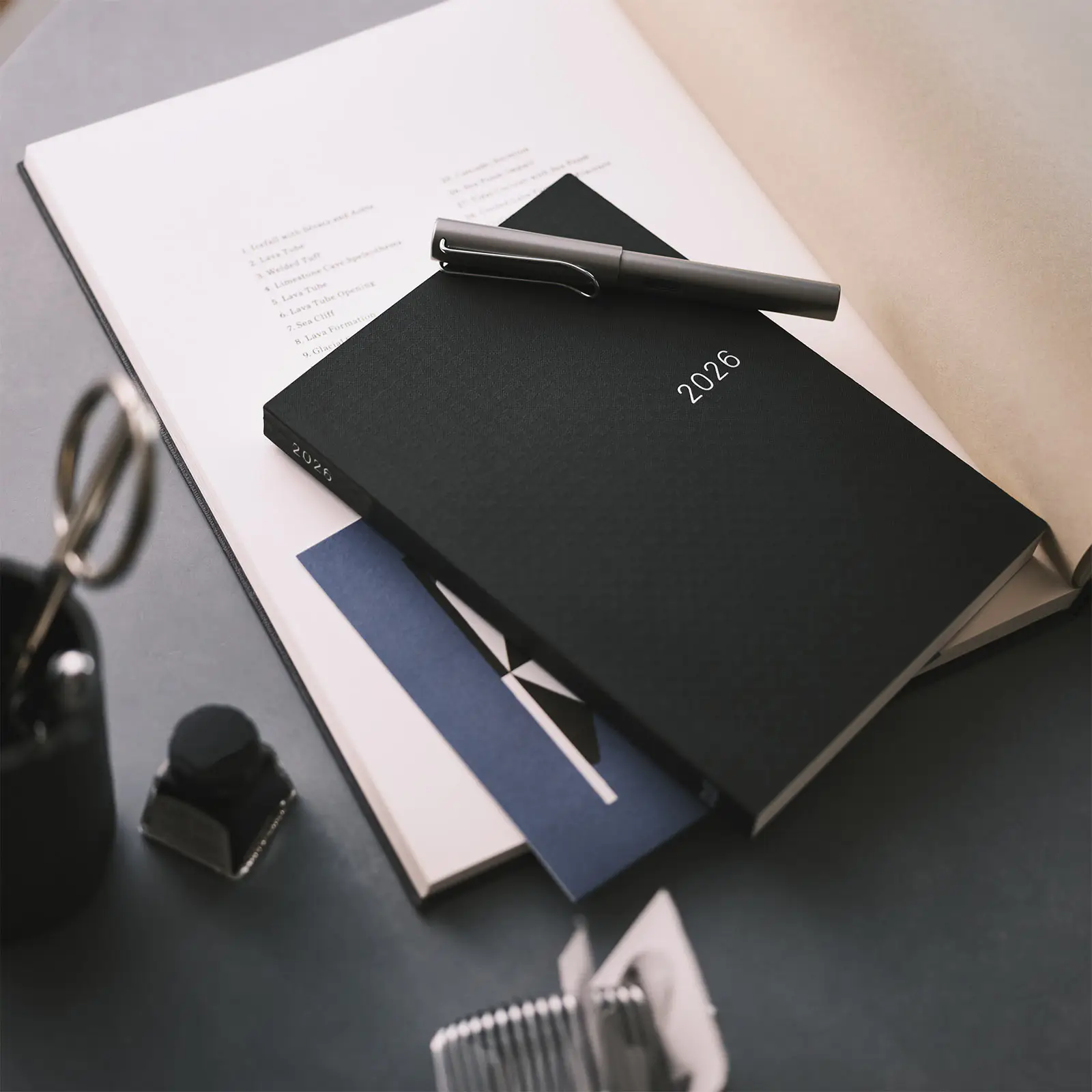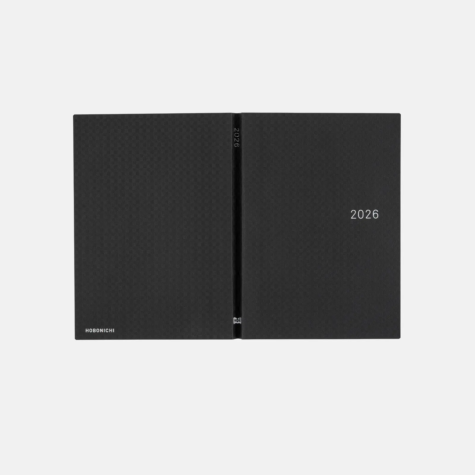 This book may seem like an ordinary black techo, but when you look closely, you will find the entire surface covered with a plaid pattern. The book is made of Takeo’s “Gingham GA,” a paper embossed with plaids reminiscent of gingham. You can see the gingham pattern from different angles of light. Although it’s embossed, it feels smooth to the touch. The year 2026 is foil-pressed in silver.