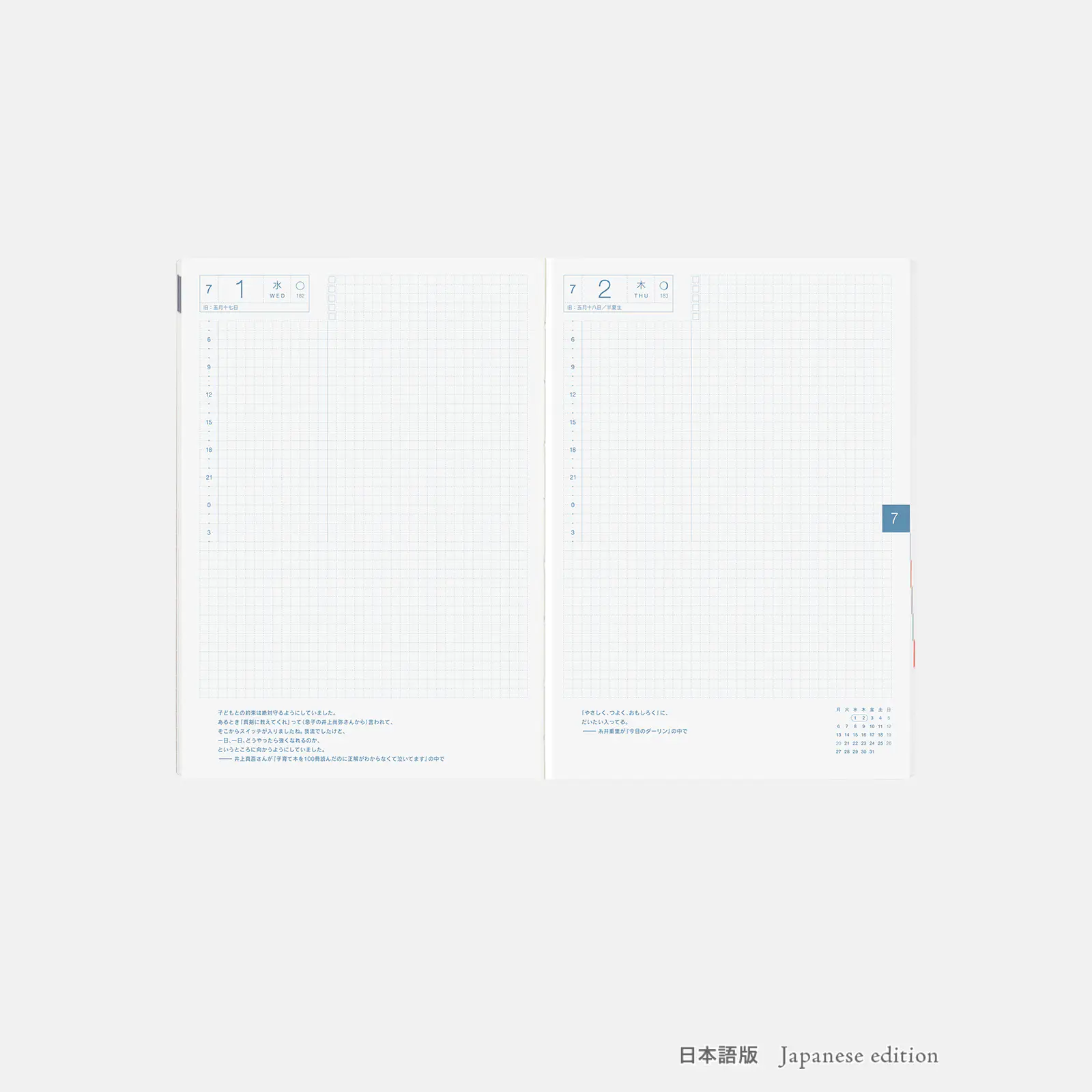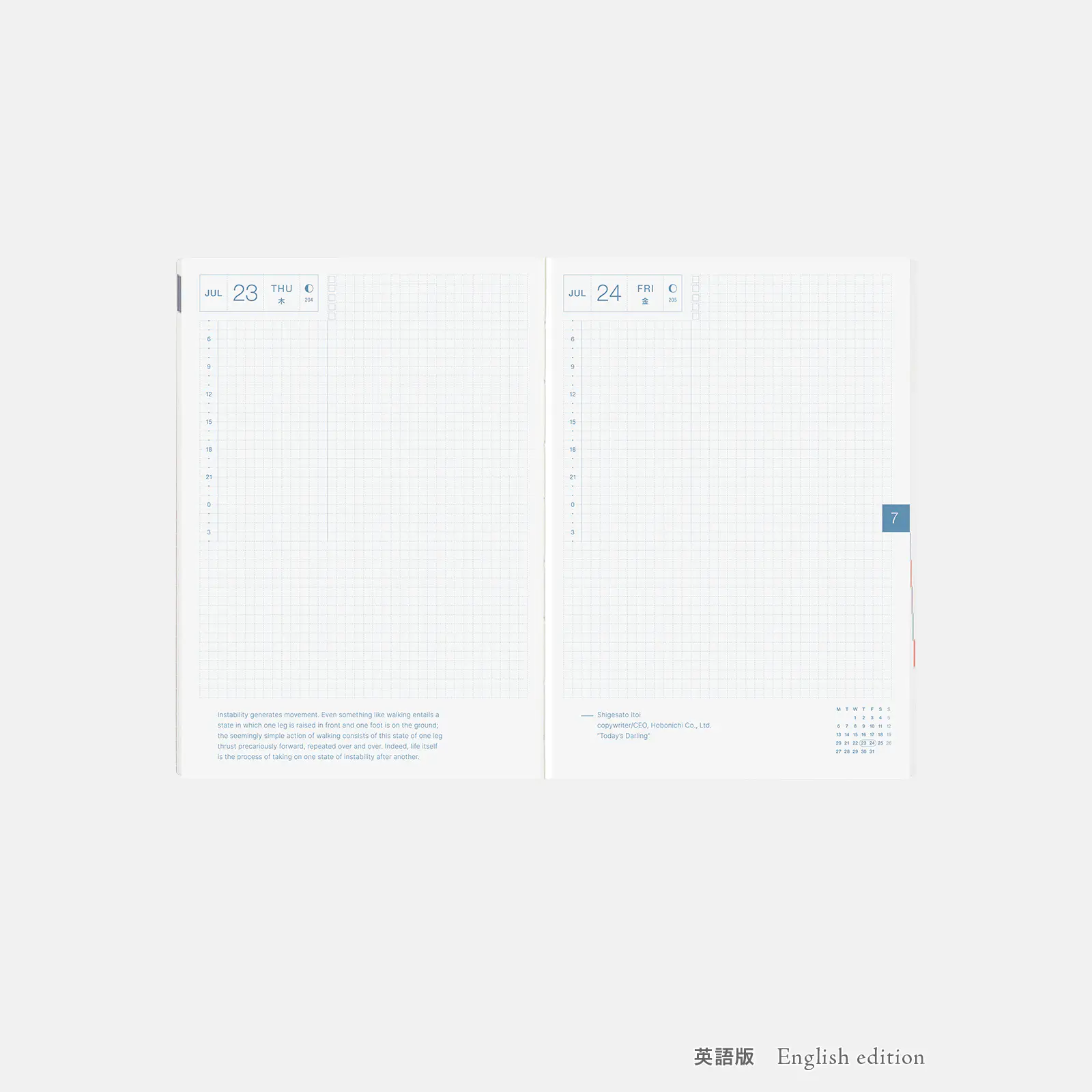 The contents are the same as the Hobonichi Techo Cousin book. The HON A5 size includes weekly pages which track a week in each two-page spread for easy planning and contain a handy time schedule.