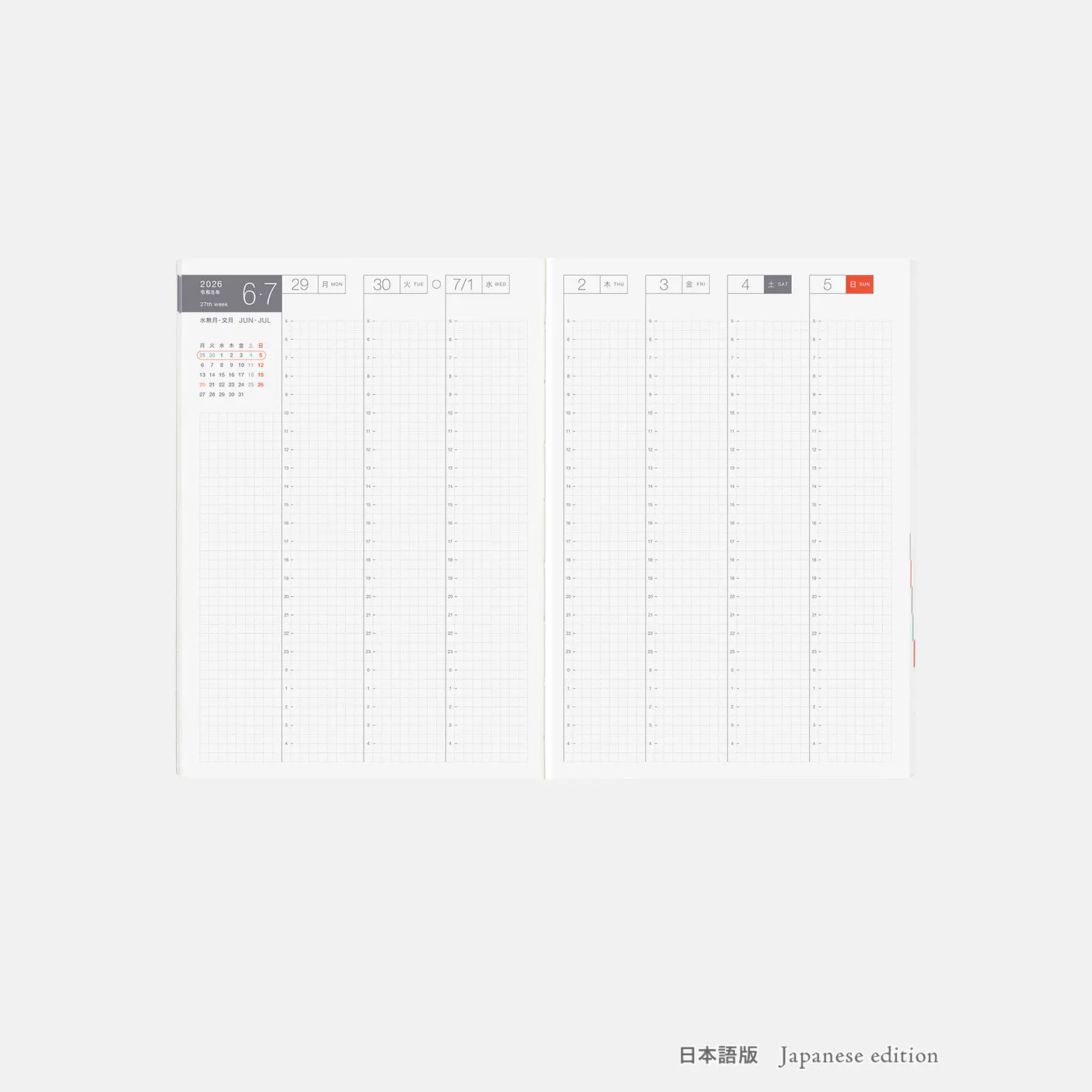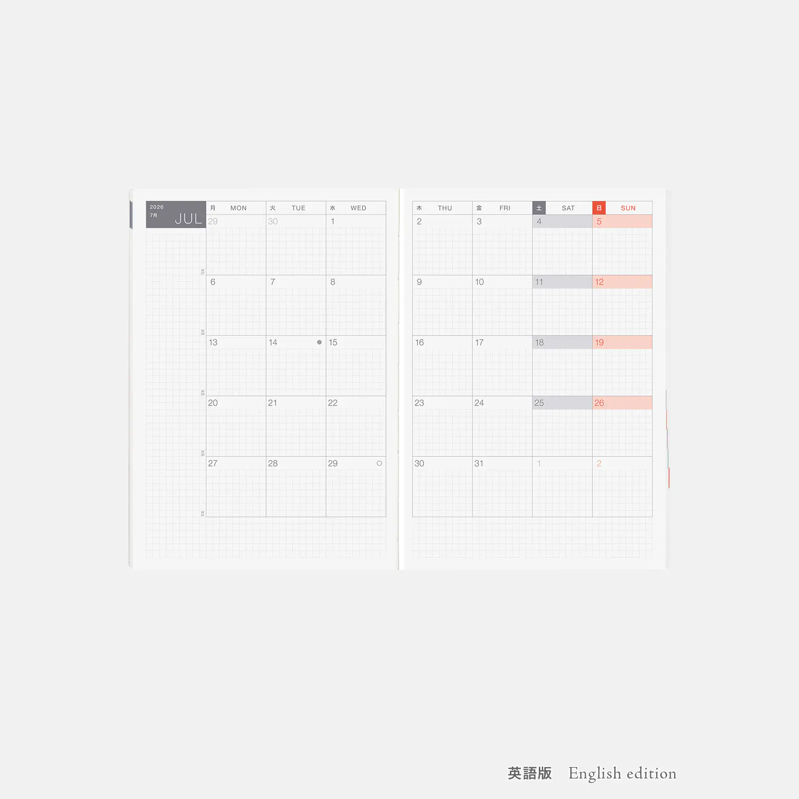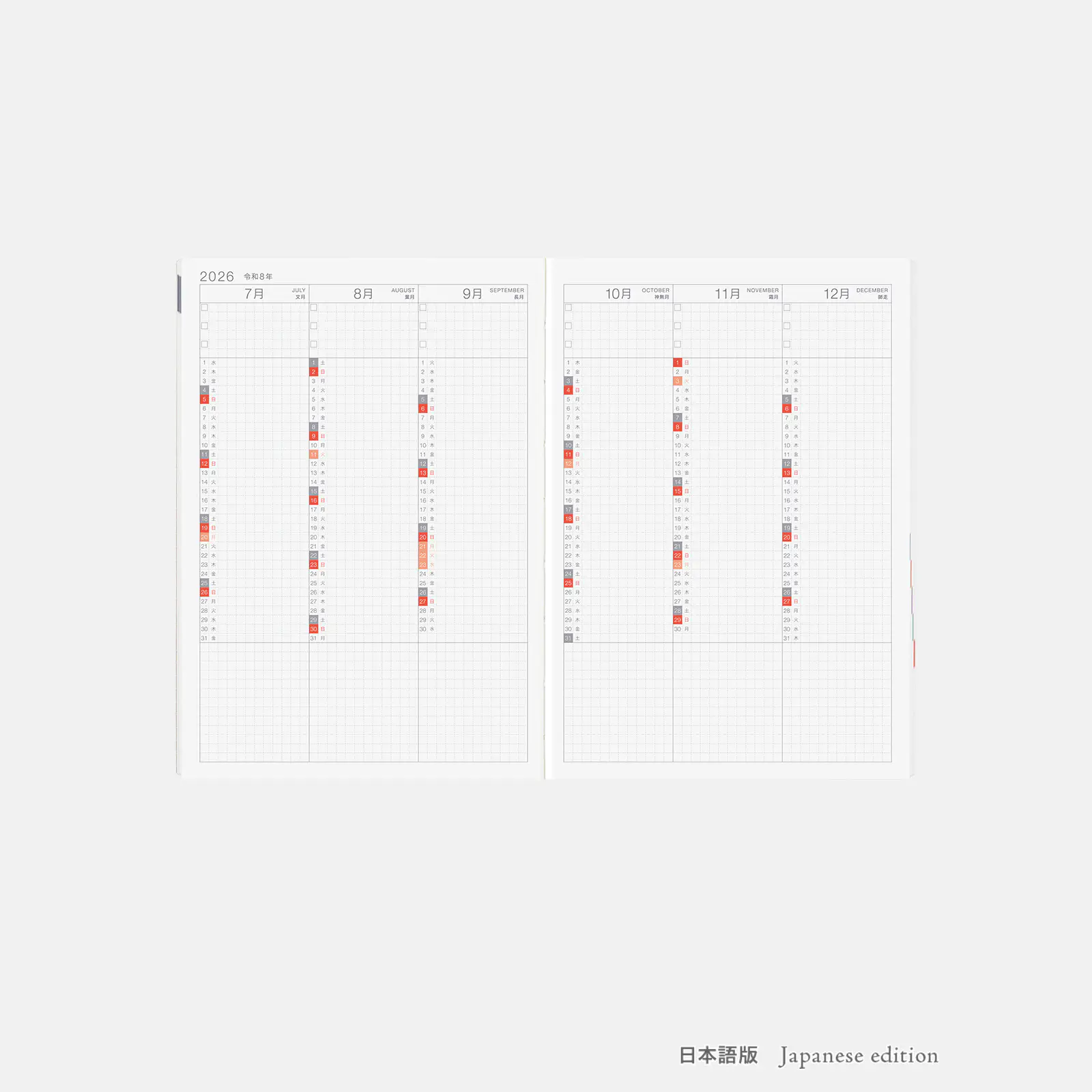 | Bonus Pages | Time Table / Graph Paper / Favorites / My 100 / Memories 2026 / 12 Switches to Help You Focus / For a Comfortable Night’s Sleep / Solar Terms / Emergency Preparedness / Gifts / Age Table / Conversion Chart / Getting the most of Hobonichi / Addresses / Personal Notes |