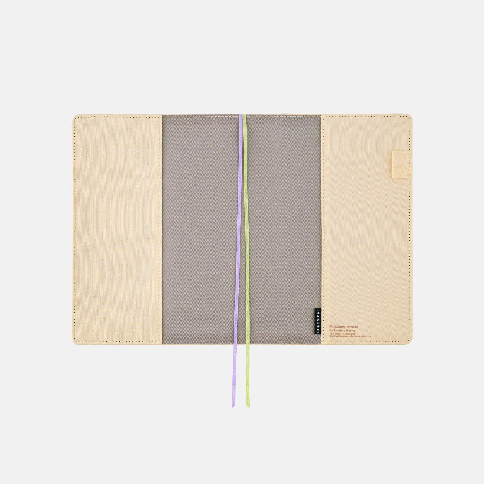 For the A5 size cover, a lovely blooming Koshinso flower is ink-jet printed on ecru-colored cotton fabric. The matte texture is applied even to the edges of the original drawing, reflecting the atmosphere of the botanical illustrations drawn by Dr. Makino.