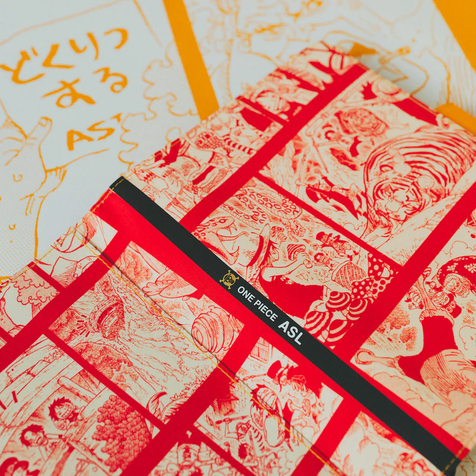 The spine of the cover has the letters ASL and is designed to recreate the look of ONE PIECE magazine’s book spine.