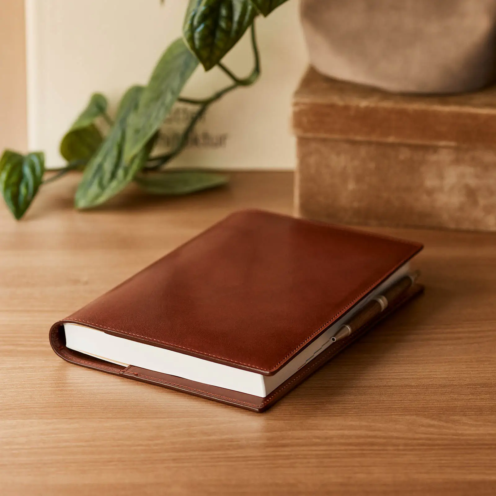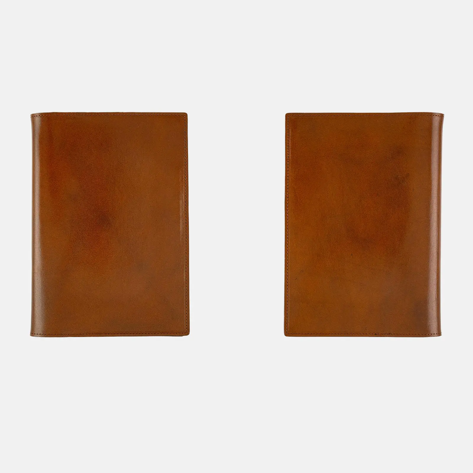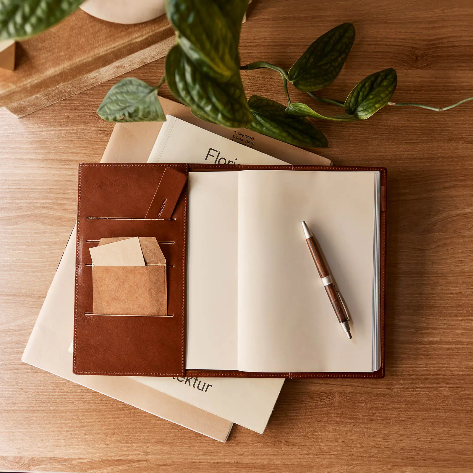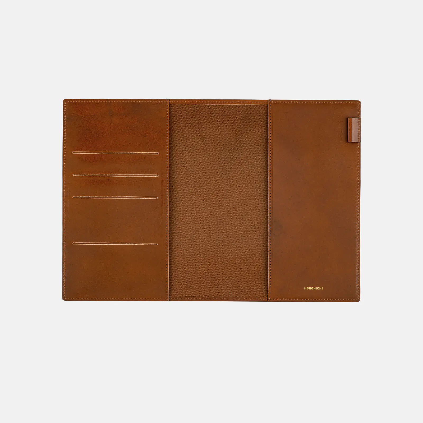 This leather design is specially designed to fit snugly around your Hobonichi Techo book while keeping it slim and comfortably portable. It does not contain butterfly stopper pen holders, and pockets are kept to a bare minimum.