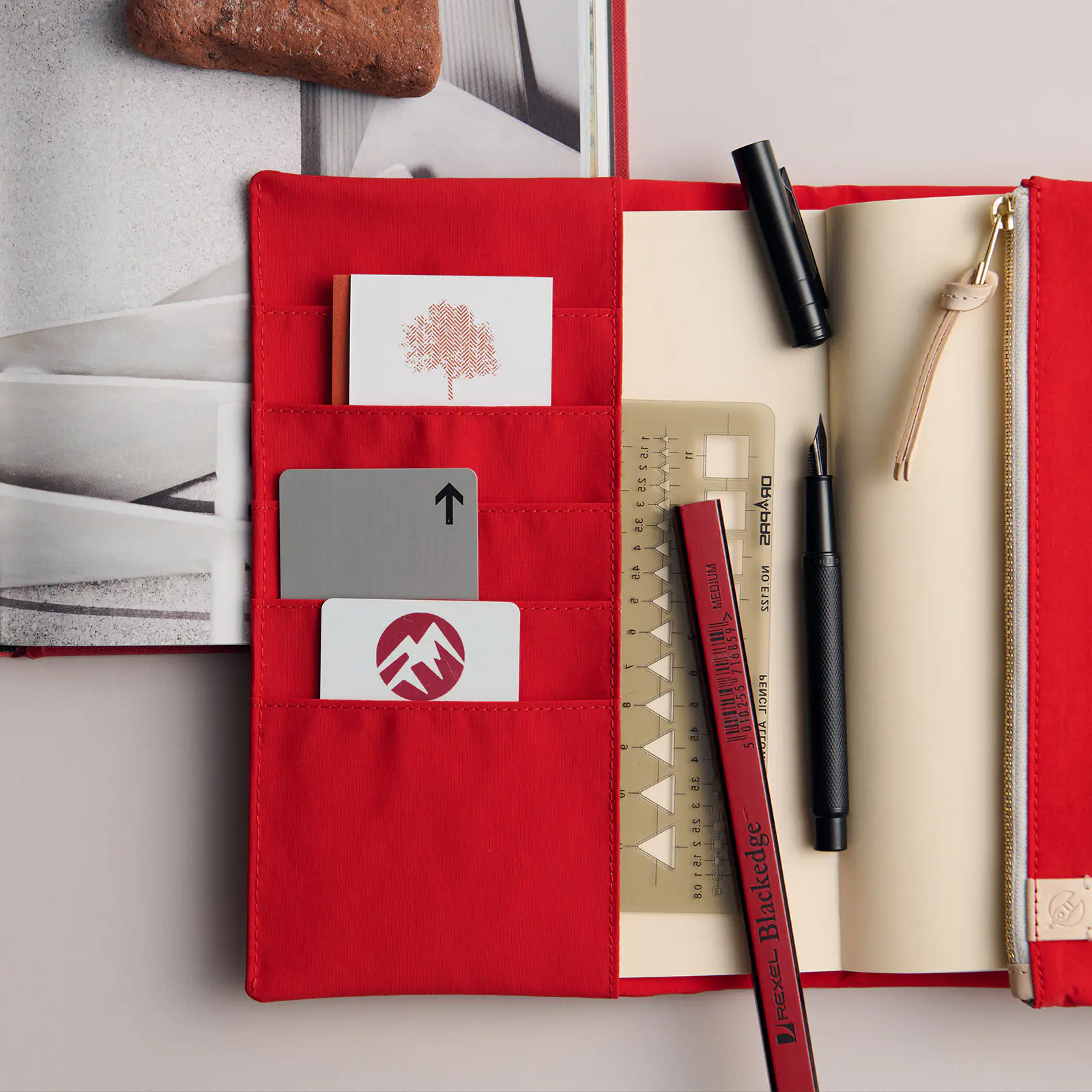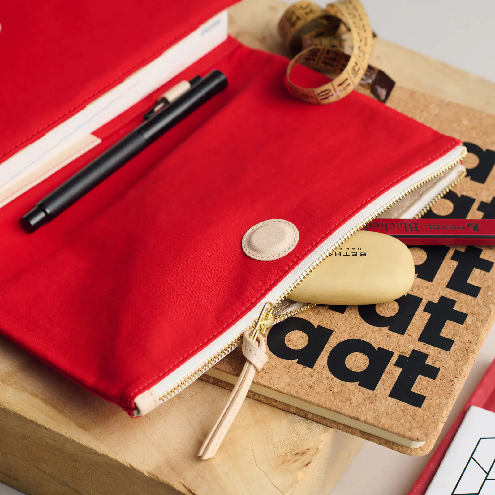 The cover closes with a hidden magnet, which is padded with a leather patch for a softer touch. The outer pocket also features a leather zipper pull.