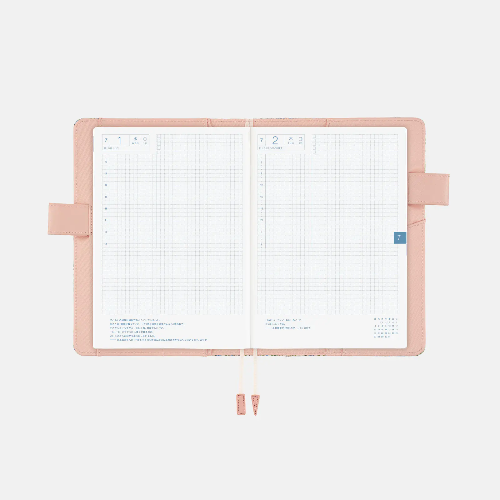 | Daily Pages | Book 1: Jan. 1 - Jun. 30, 2026 (187 pages) Book 2: Jul. 1 - Dec. 31, 2026 (190 pages) *A page is included at the beginning of each month to help in planning ahead. *All daily pages include daily quotes. *Includes a mini monthly calendar at the bottom right of every two-page spread (Monday-start). *Additionally, a blank two-page spread (three pages for Book 2) is featured at the beginning to provide a free area when starting out the book. |