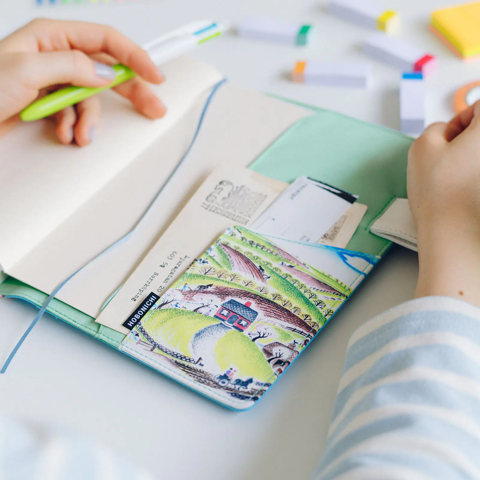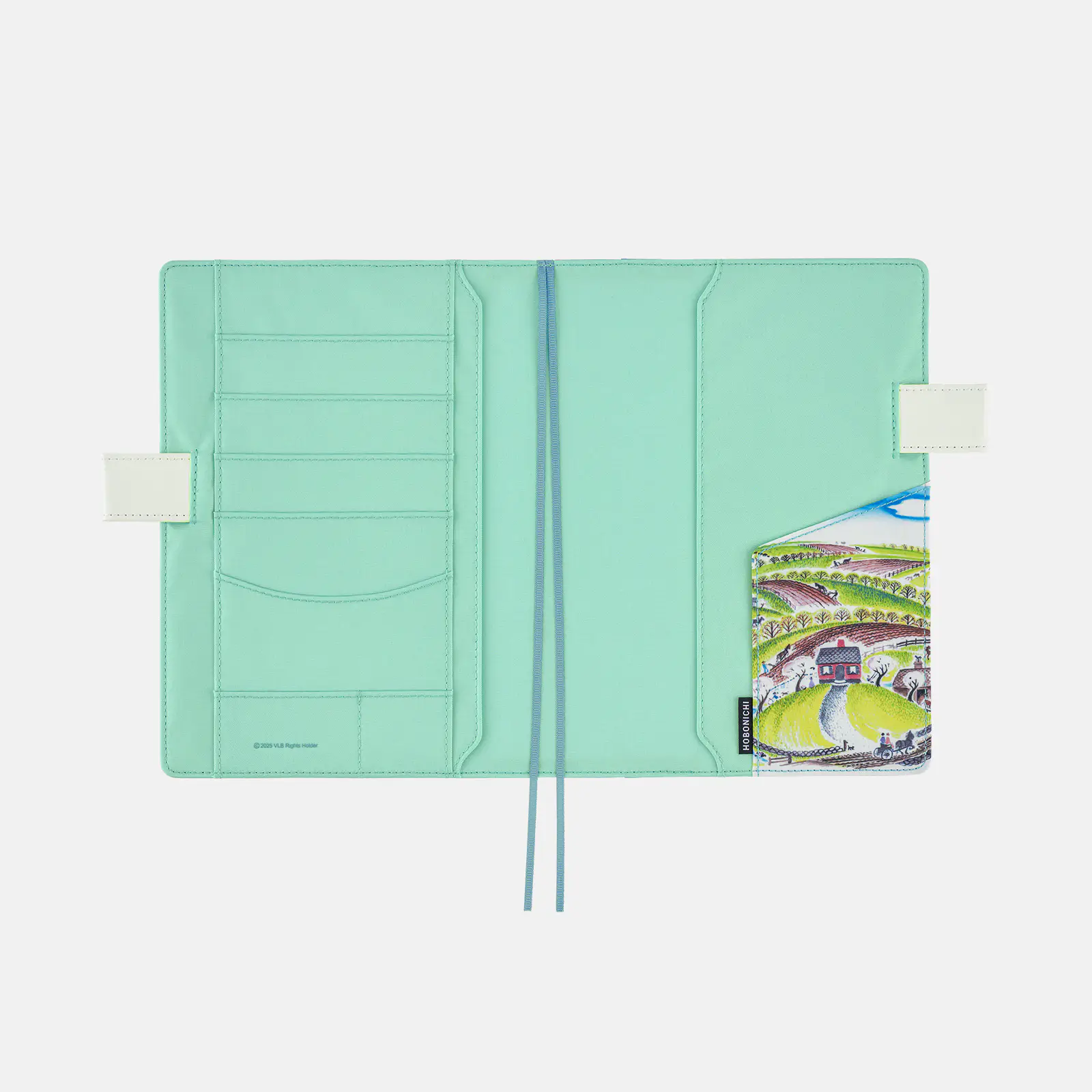 The cover interior is mint green. The right-hand pocket represents spring, with mild rays of sunshine, blooming flowers on the apple tree, and children playing. The butterfly stoppers are a white faux leather, and the bookmarks are simple, light blue ribbons.