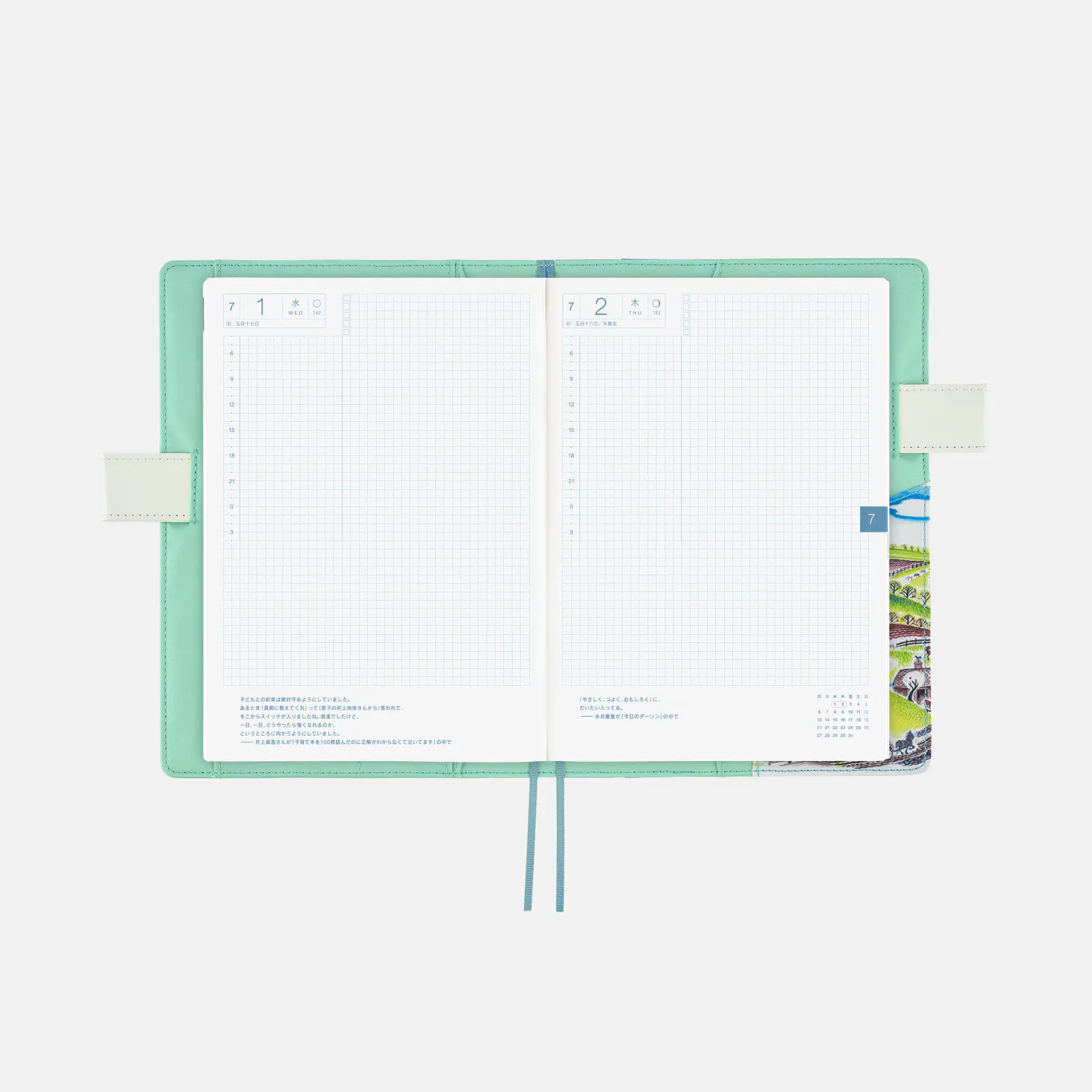 | Daily Pages | Book 1: Jan. 1 - Jun. 30, 2026 (187 pages) Book 2: Jul. 1 - Dec. 31, 2026 (190 pages) *A page is included at the beginning of each month to help in planning ahead. *All daily pages include daily quotes. *Includes a mini monthly calendar at the bottom right of every two-page spread (Monday-start). *Additionally, a blank two-page spread (three pages for Book 2) is featured at the beginning to provide a free area when starting out the book. |