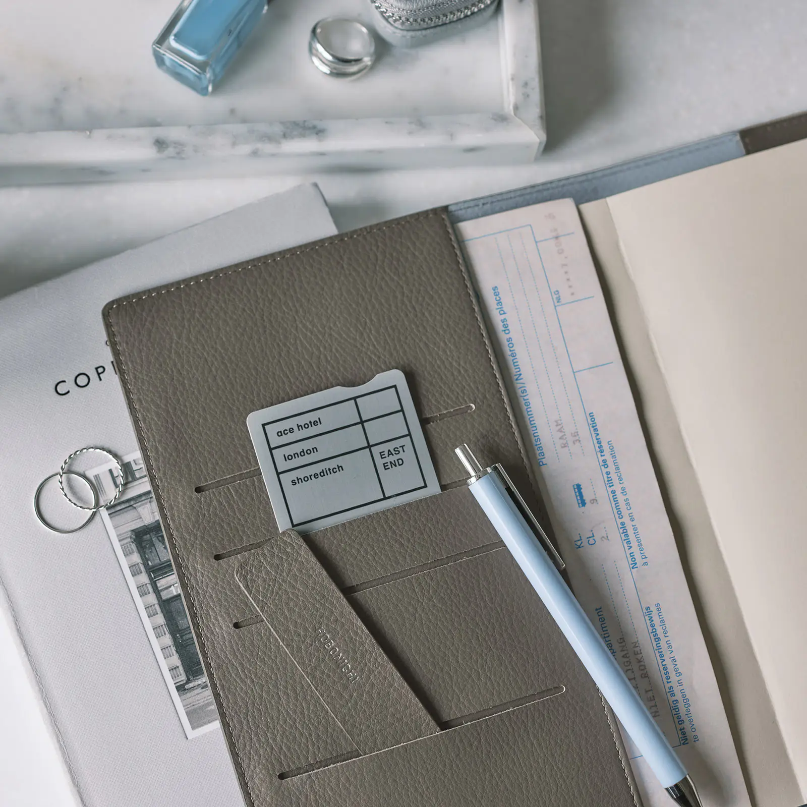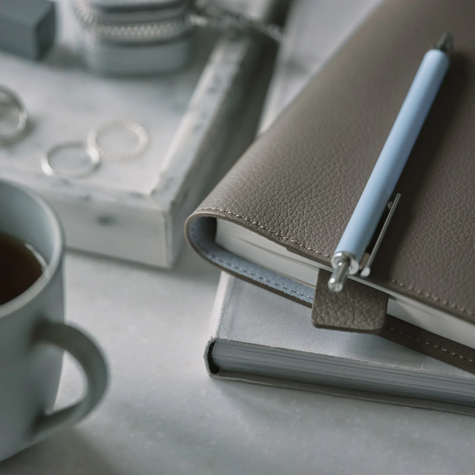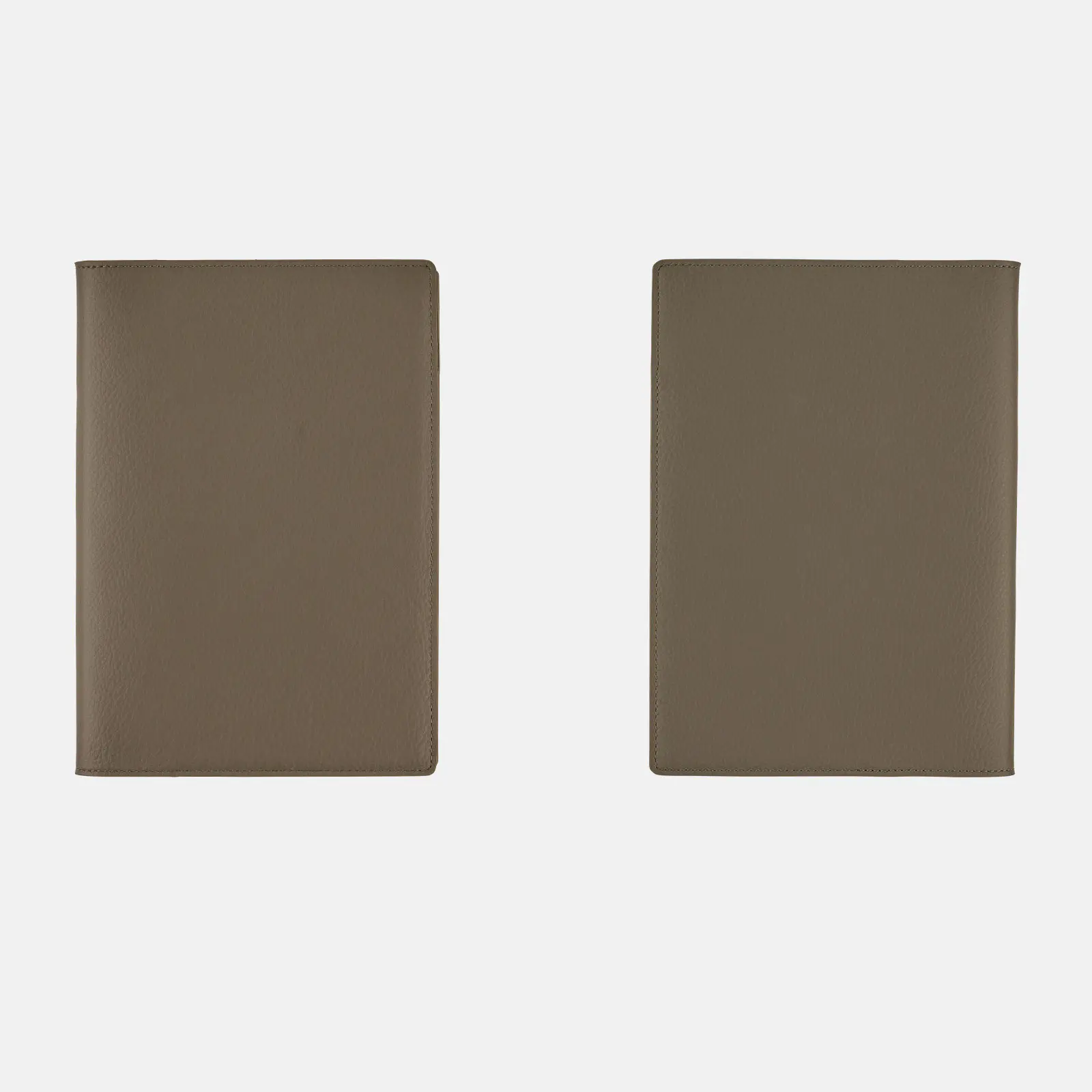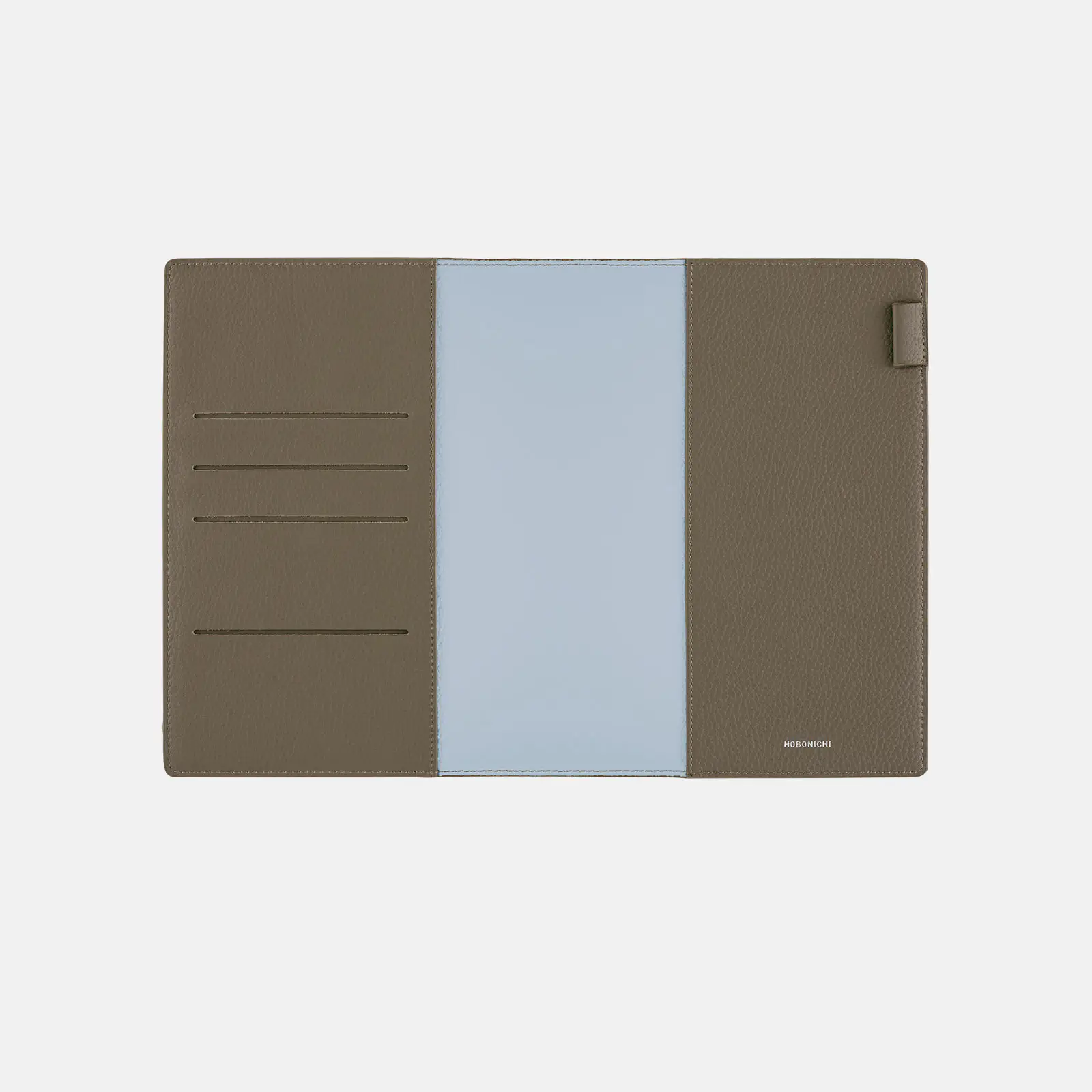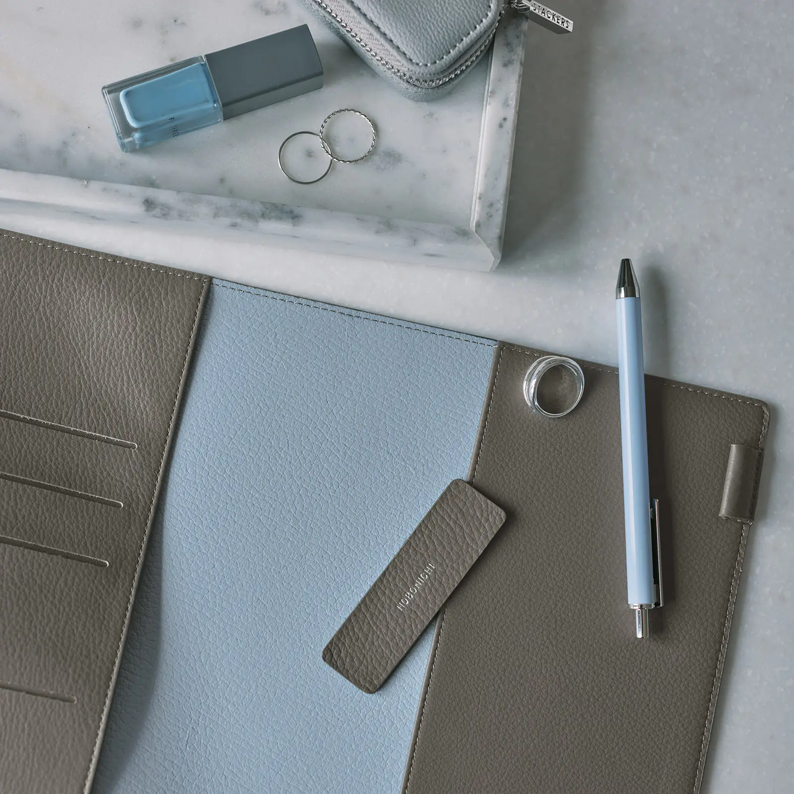 The front of the cover is in a warm gray, while the back is in a cool-toned light blue. A specialized process was used to create this dual-tone on one single piece of leather. The unique sleekness of the leather makes it soft to the touch, and thanks to its finely grained texture, scuff marks will be less visible.
