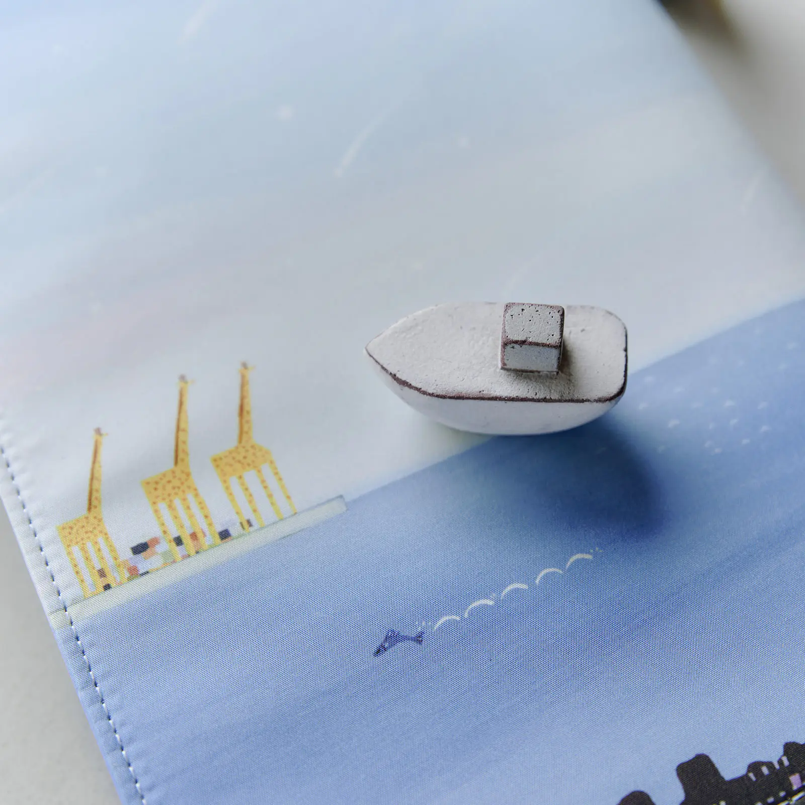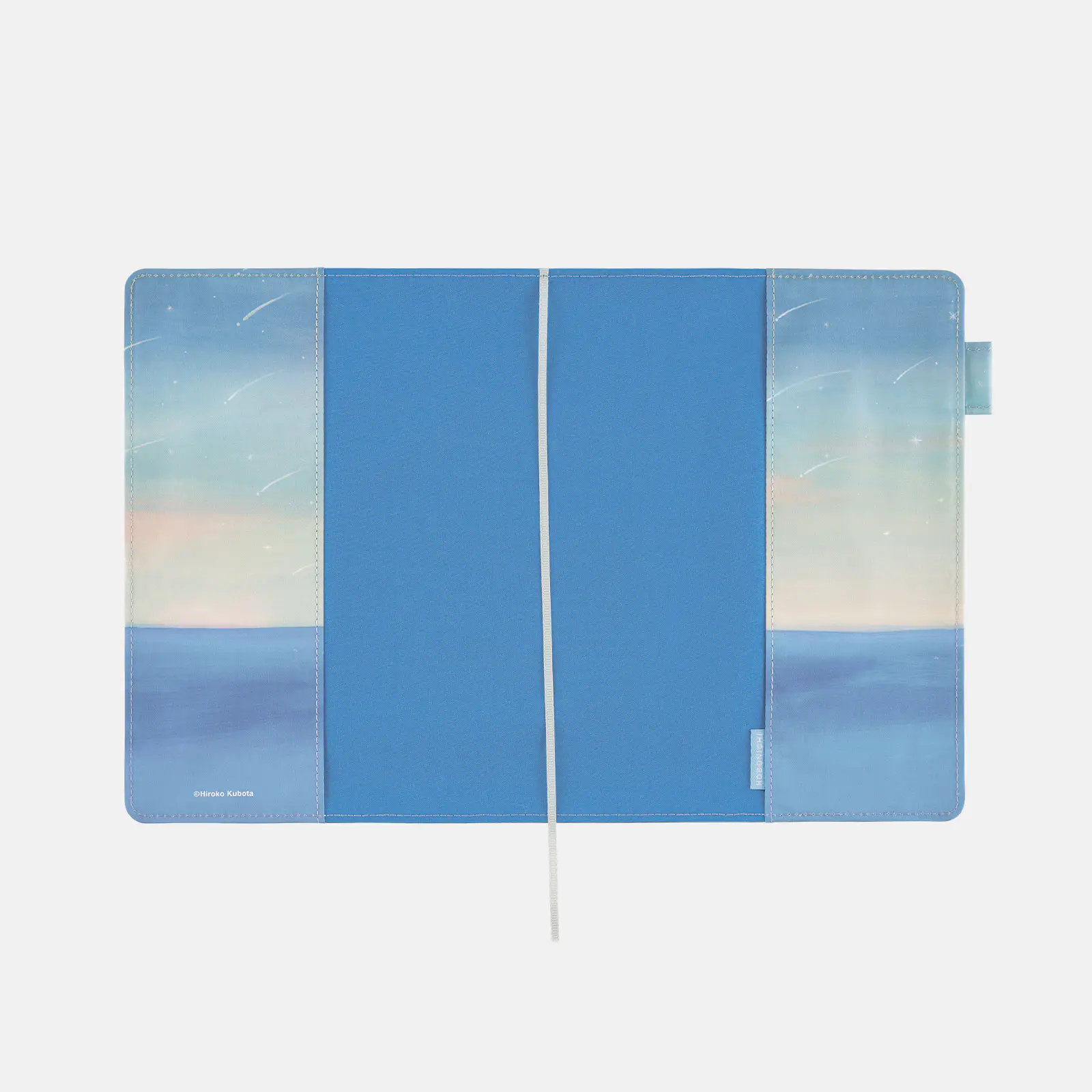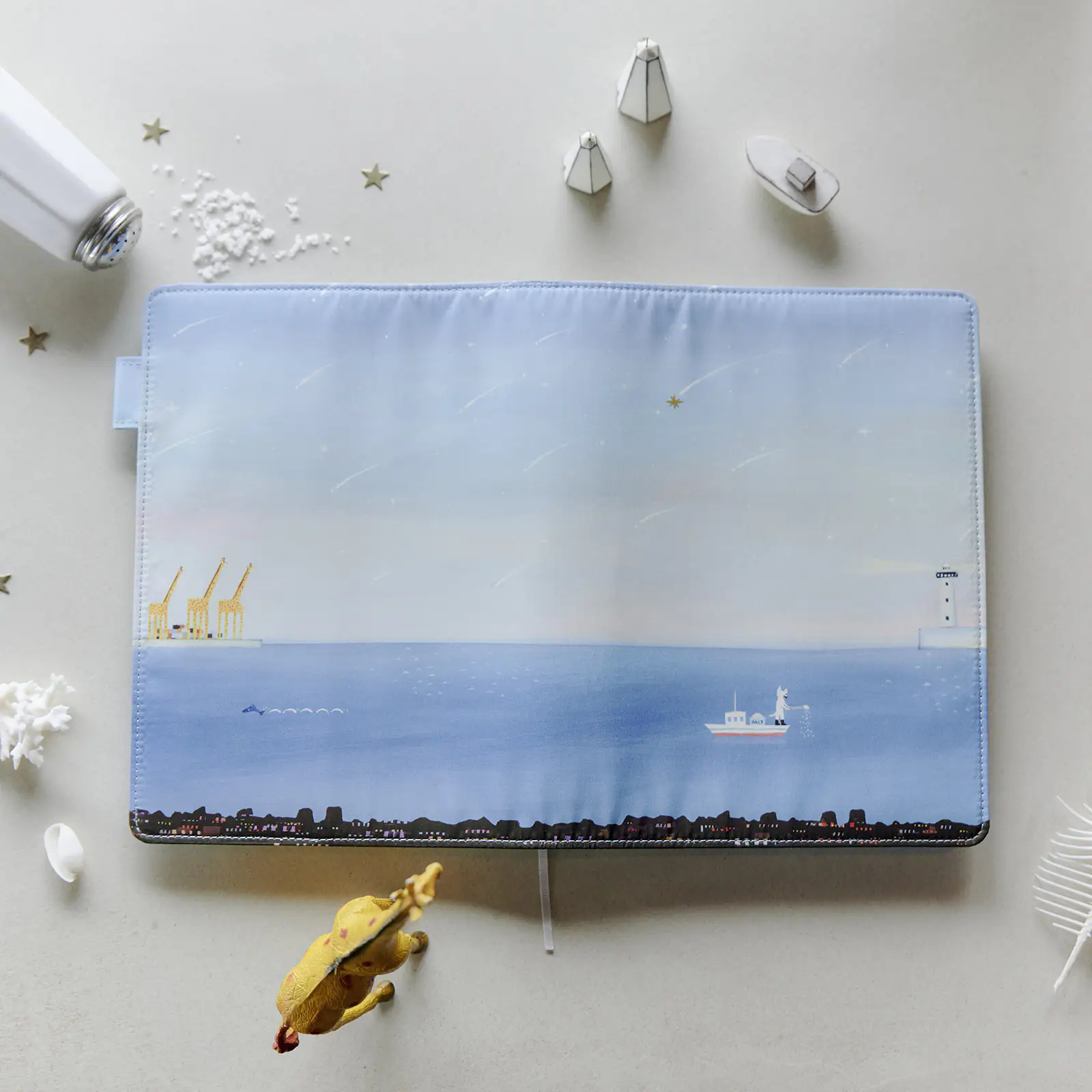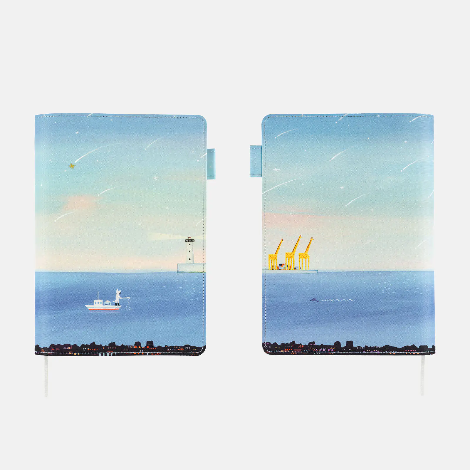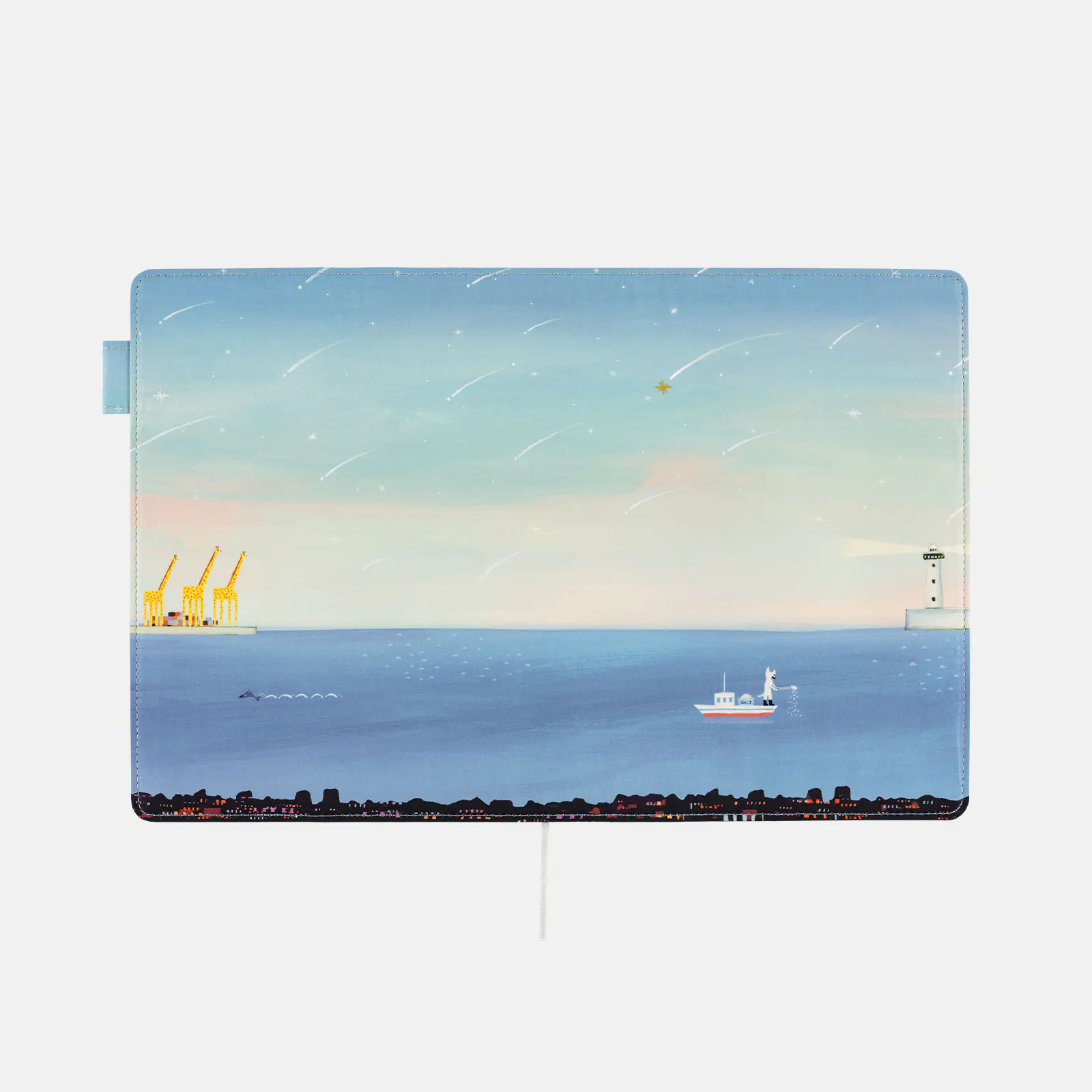 The sky and sea expand into the interior of the cover. The bookmark is in a pale gray with a muted shine, blending into the quiet scenery. The pen hook on the inside lets you store your pen by its clip, while still maintaining the cover’s clean, refined silhouette when closed.
