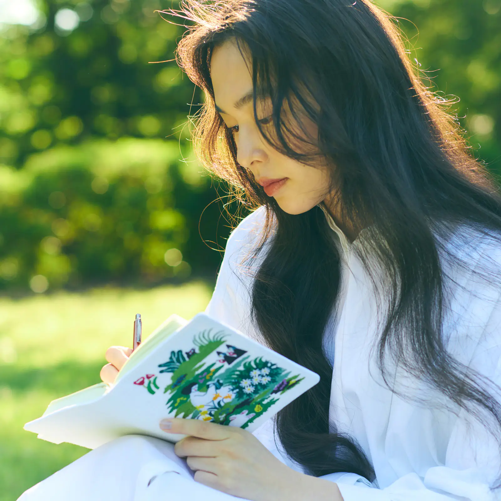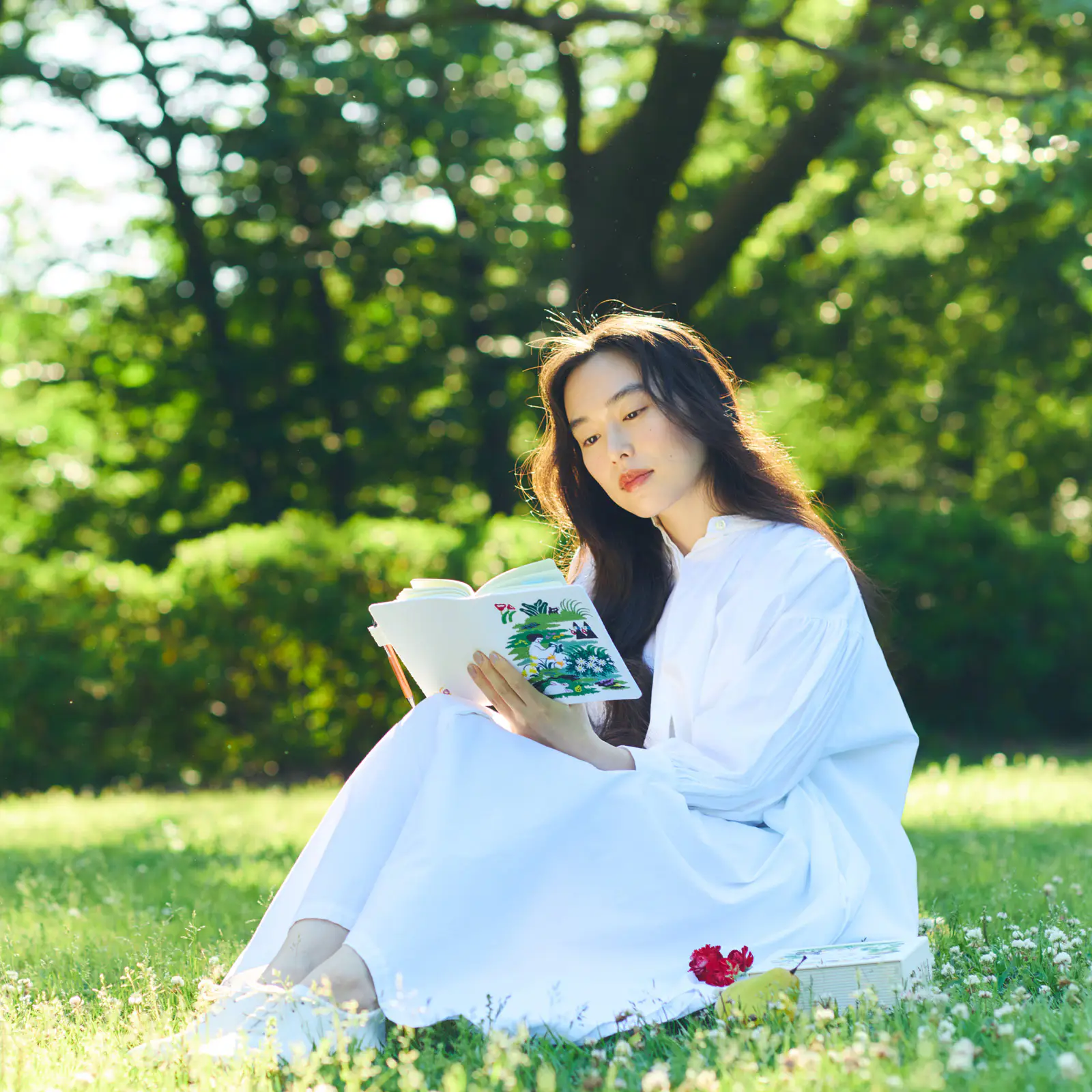 At the center of this garden is its residence, sitting down and reading a book.