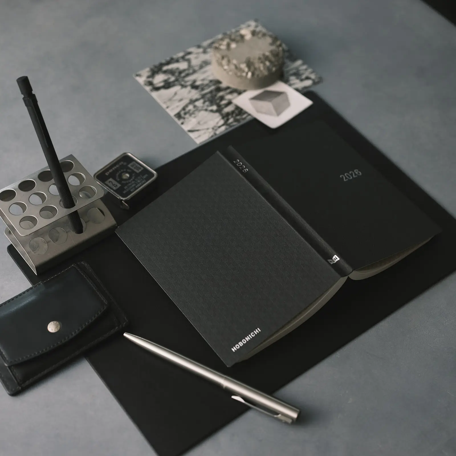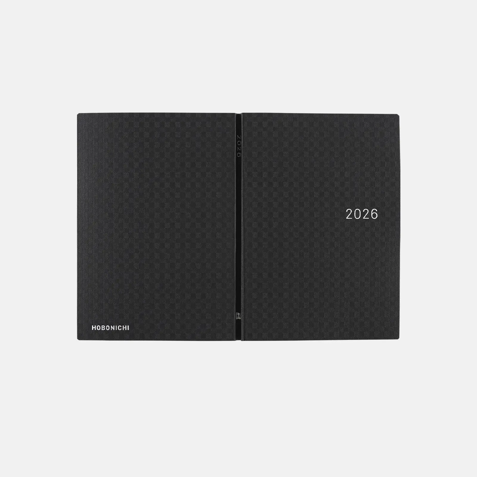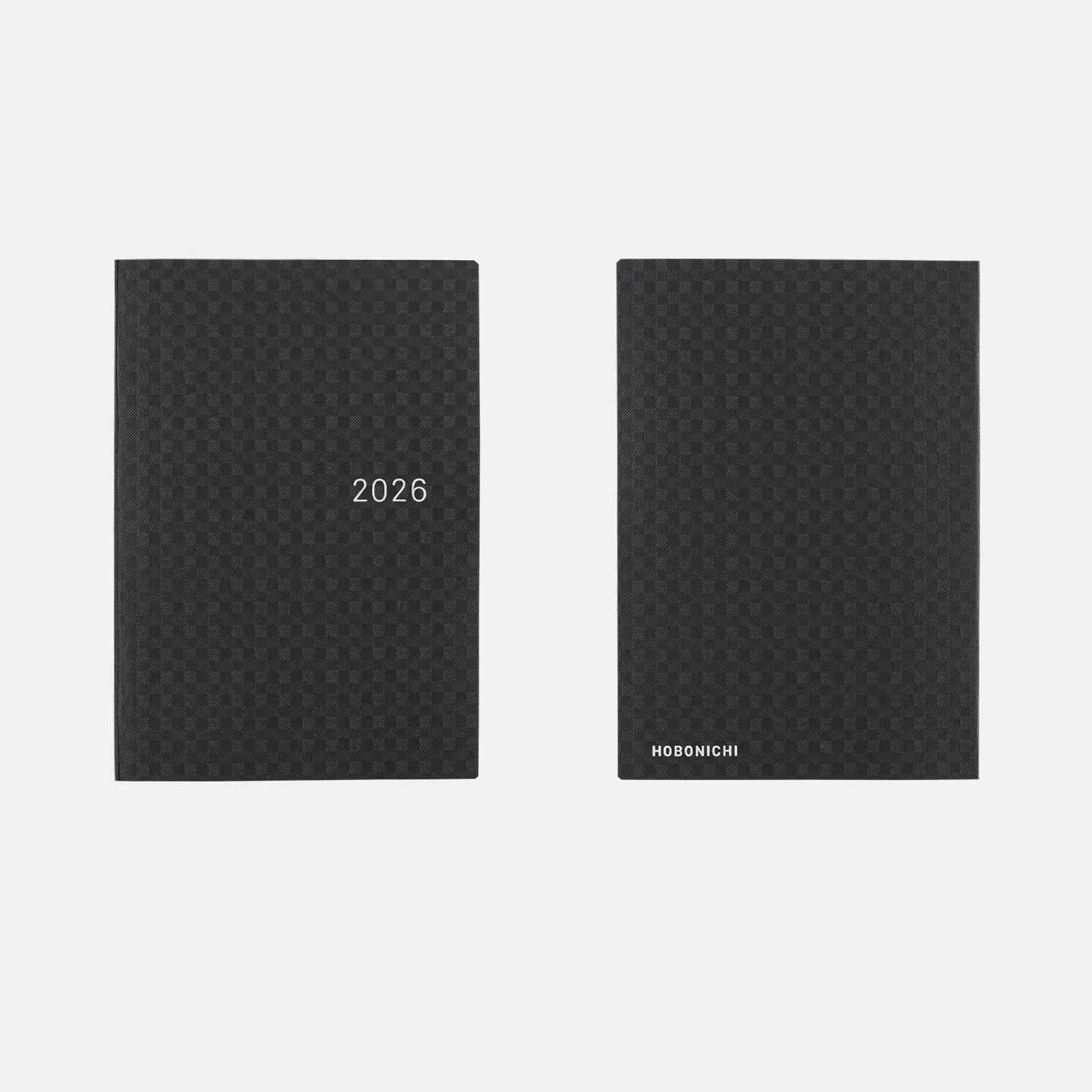 This book may seem like an ordinary black techo, but when you look closely, you will find the entire surface covered with a plaid pattern. The book is made of Takeo’s “Gingham GA,” a paper embossed with plaids reminiscent of gingham. You can see the gingham pattern from different angles of light. Although it’s embossed, it feels smooth to the touch. The year 2026 is foil-pressed in silver.