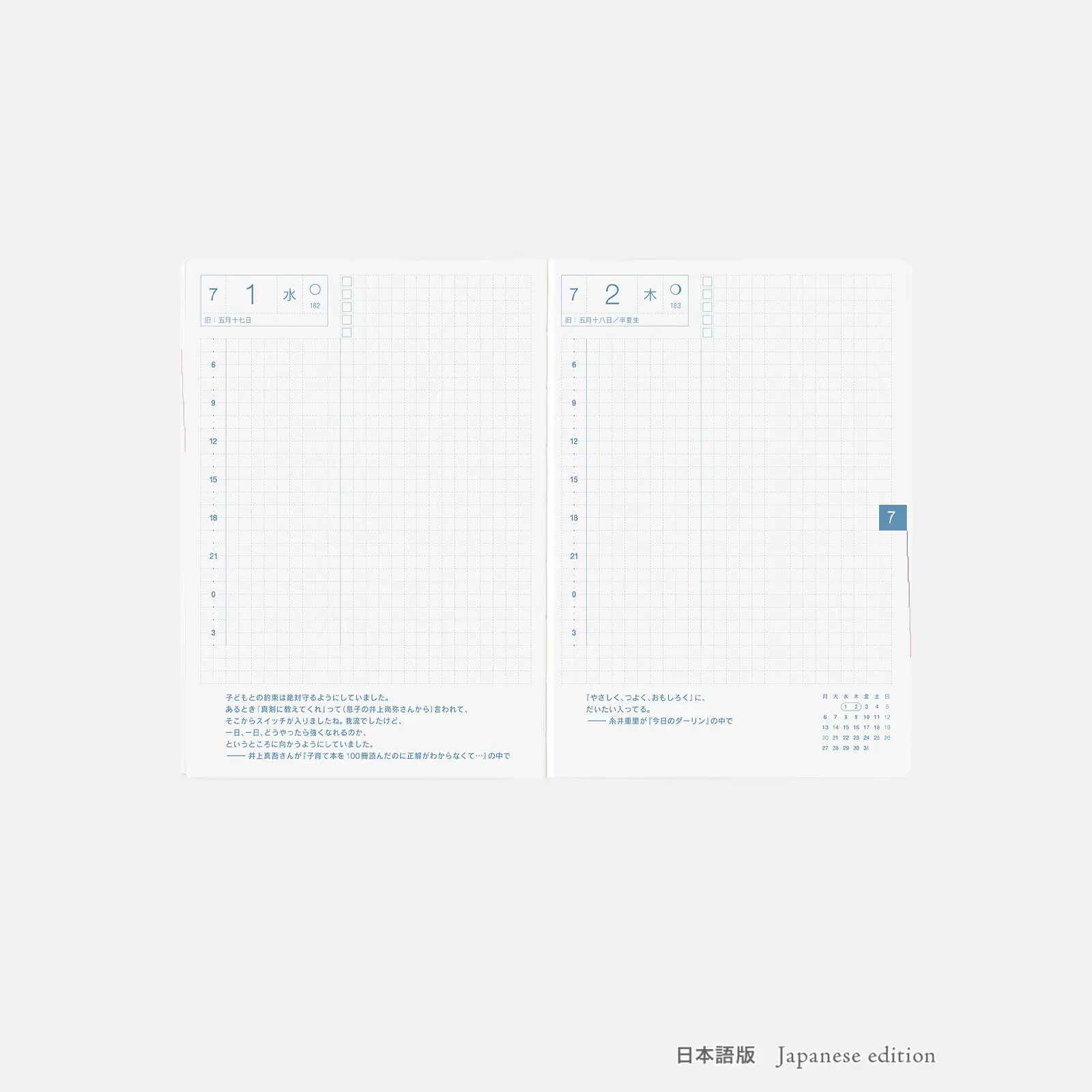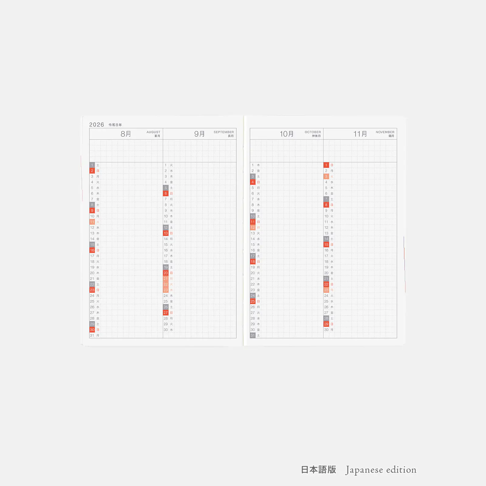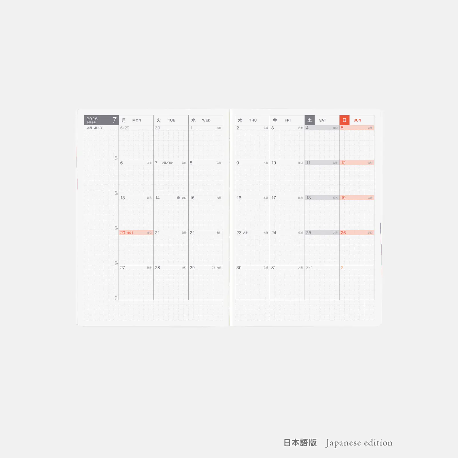 | Bonus Pages | Time Table / Graph Paper / Favorites / My 100 / Memories 2026 / 12 Switches to Help You Focus / For a Comfortable Night’s Sleep / Solar Terms / Emergency Preparedness / Conversion Chart / Getting the most of Hobonichi / Gifts / Age Table / Addresses / Personal Notes |
