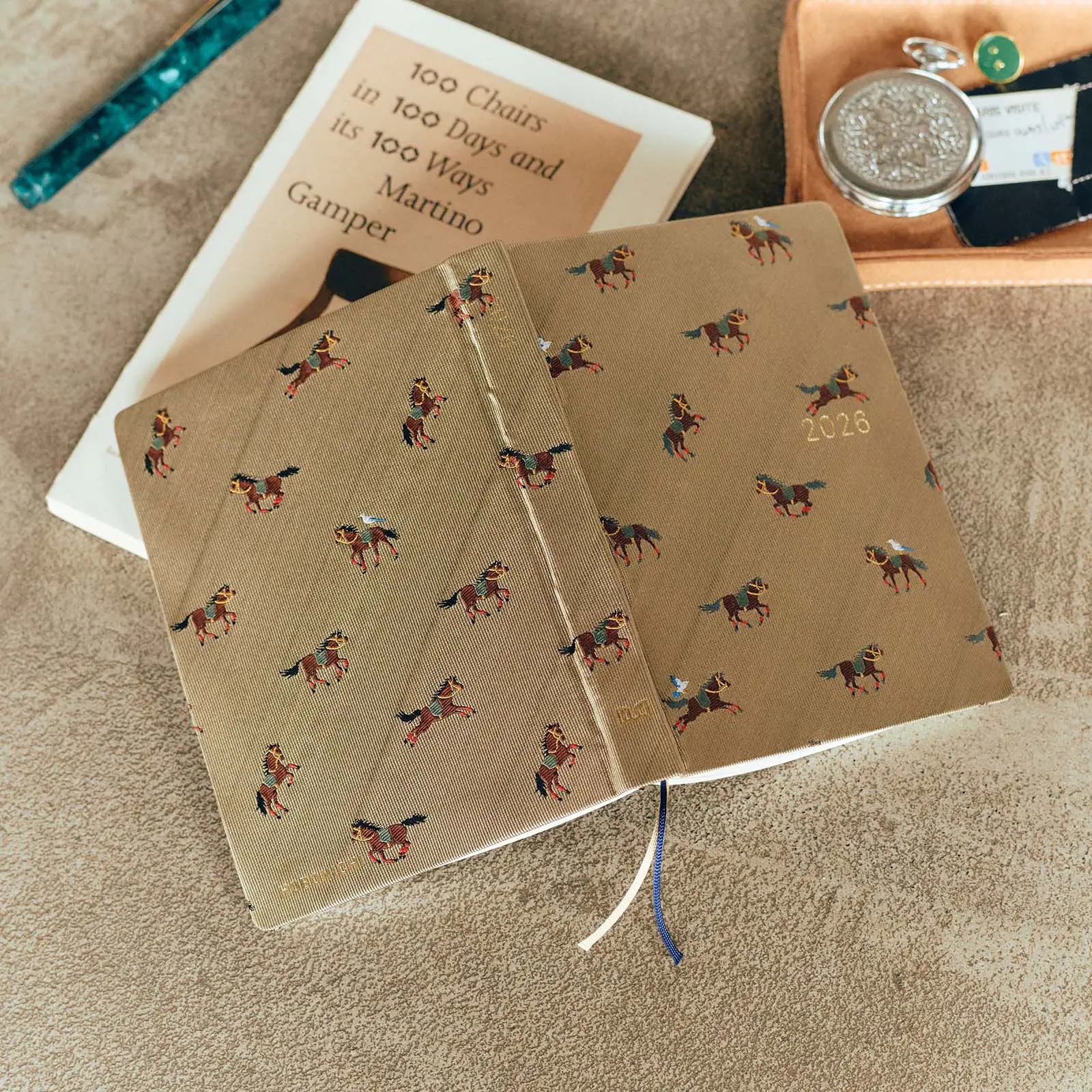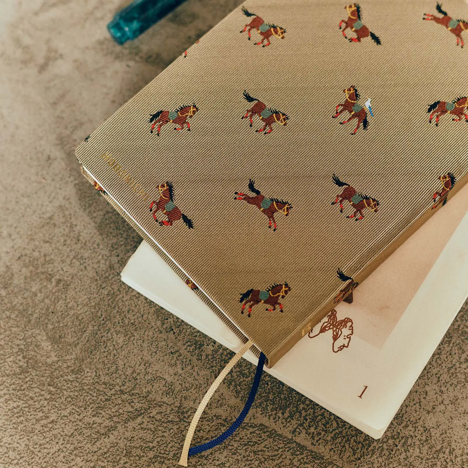The Bow & Tie series is covered with the same textured, shiny fabric used in neckties. The material has a beautiful gloss and is soft to the touch. On this Galloping Horses cover, a variety of horses—some galloping, some walking—are woven into a chic beige background. The horses spending their time in leisure are depicted in fine detail through the intricate weave of necktie fabric.